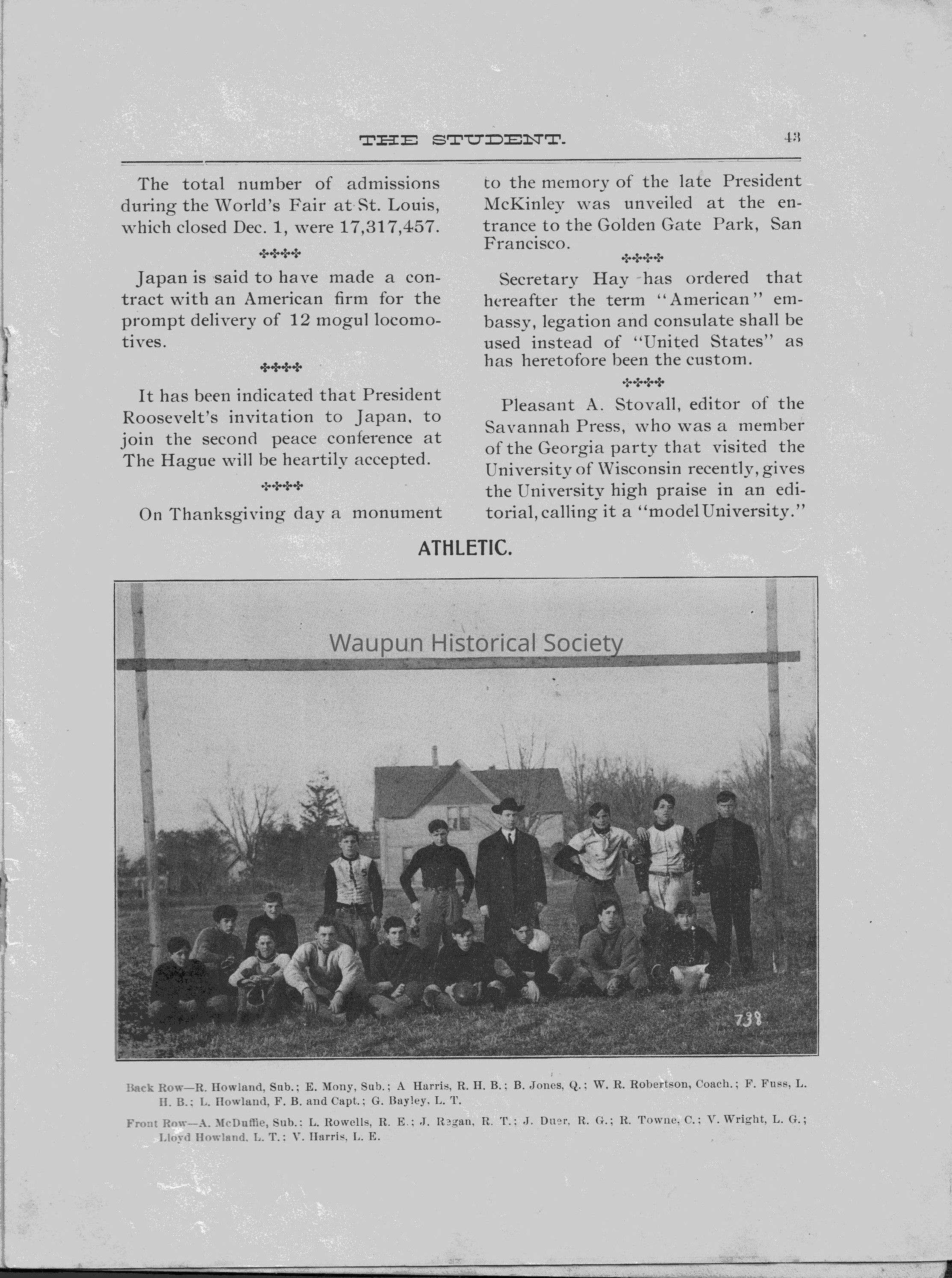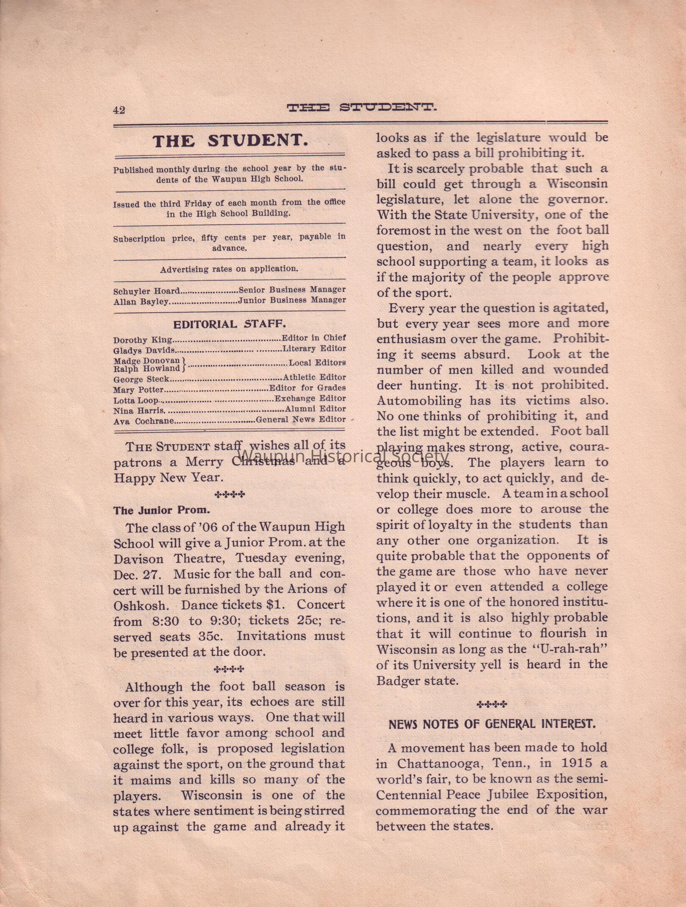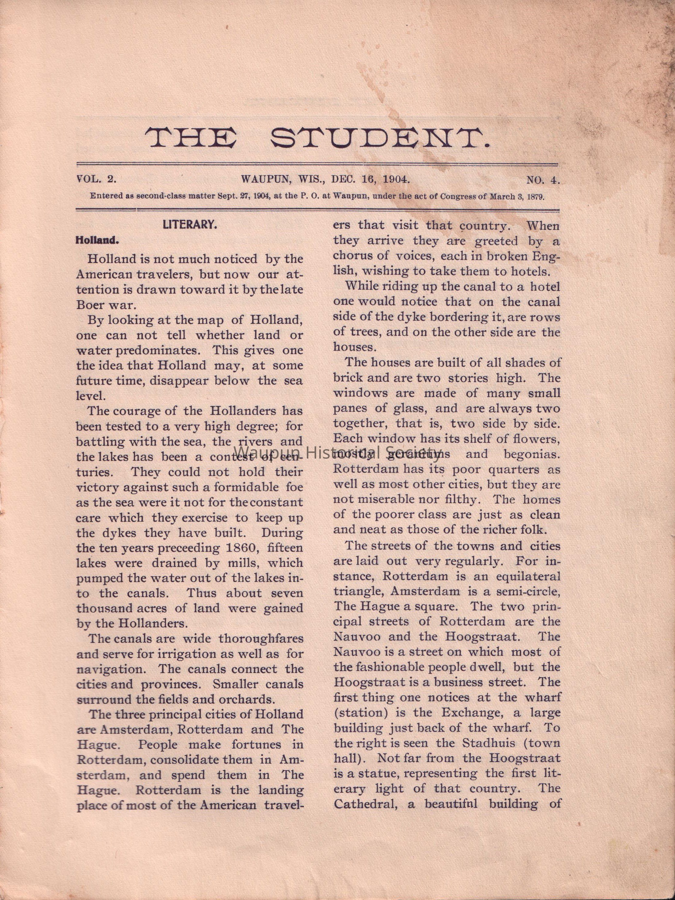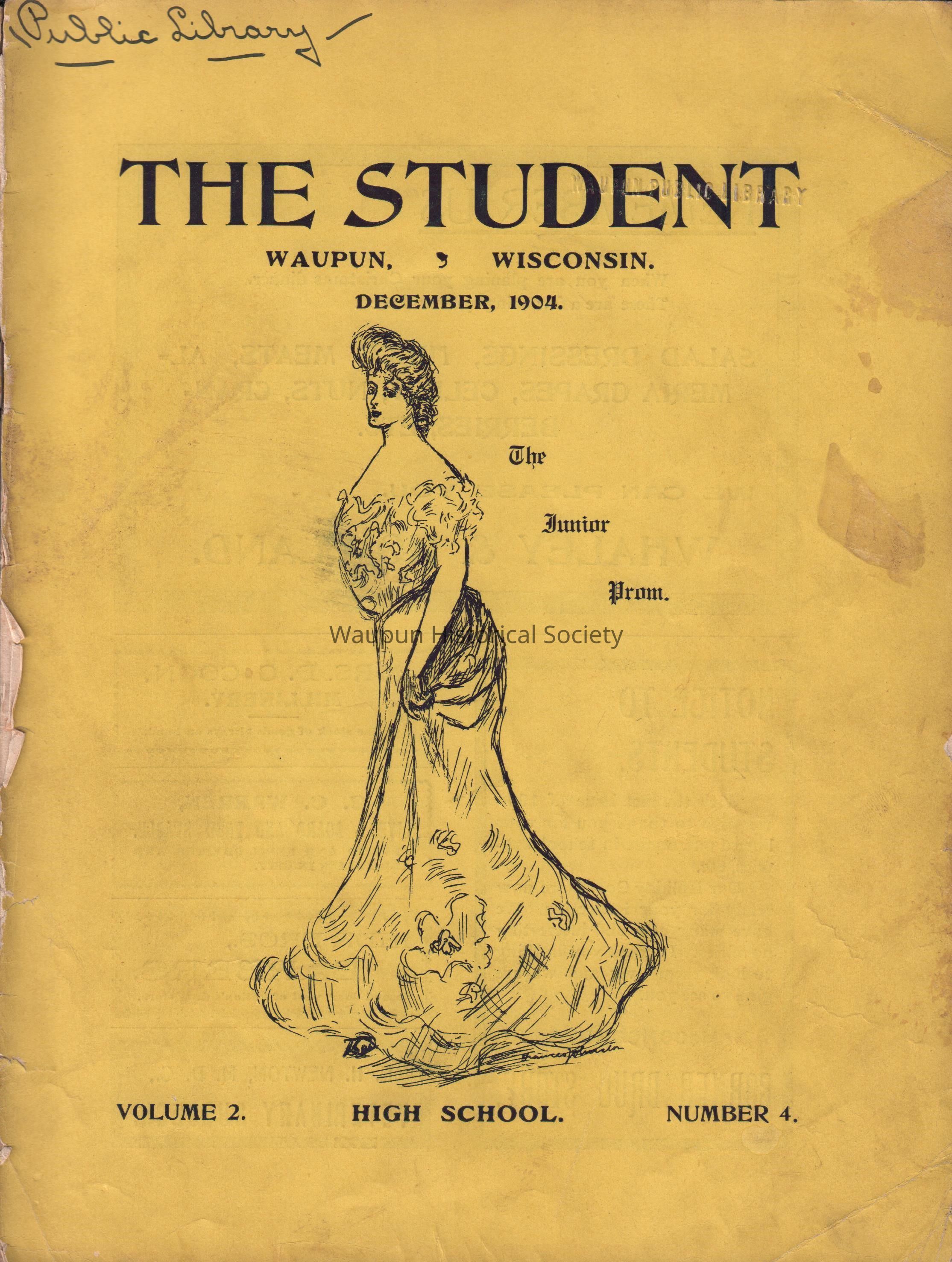 monthly publication by the students of Waupun High school in Dec. 1904, yellow and black cover, white pages with black print, # 37 thru 52Acquisition