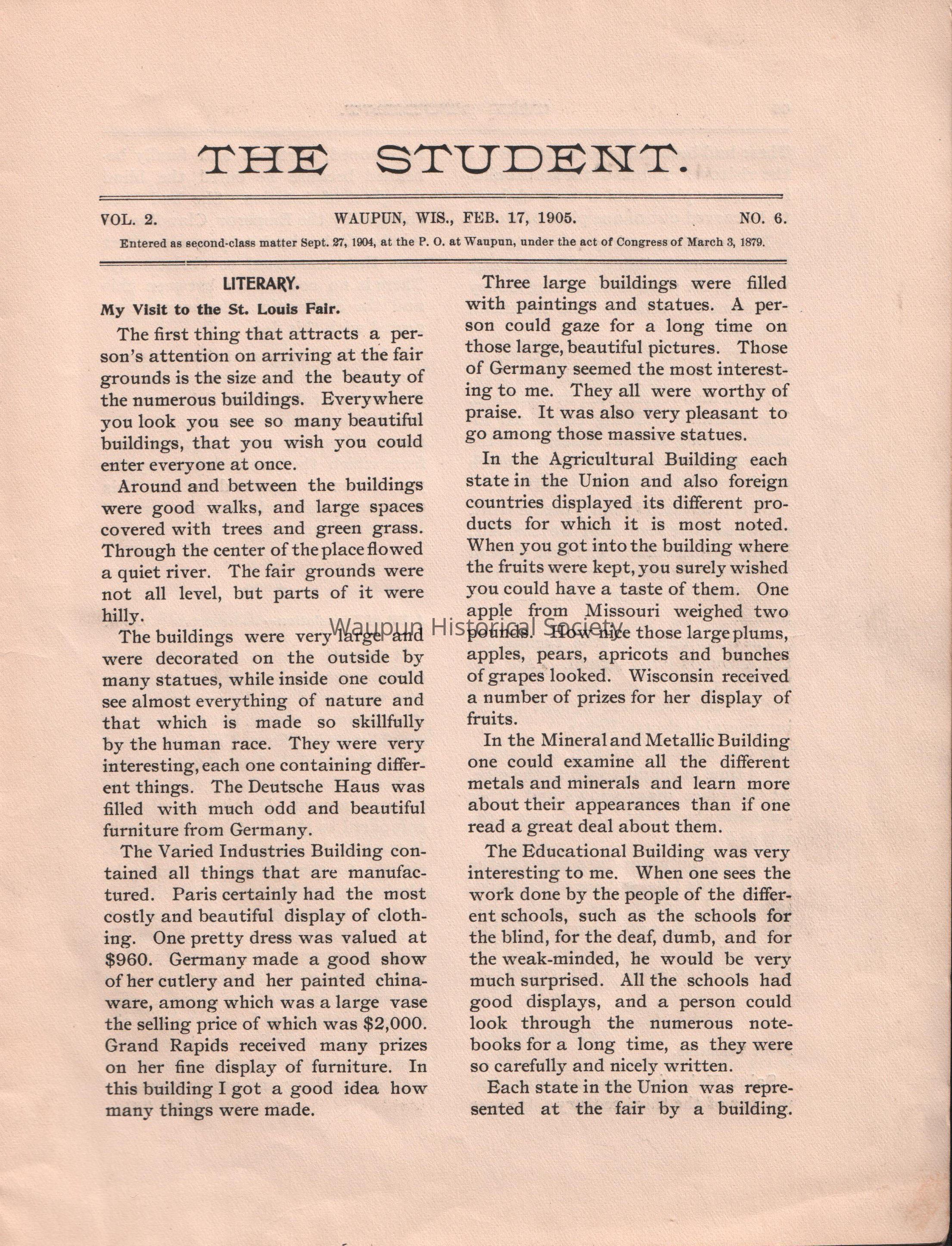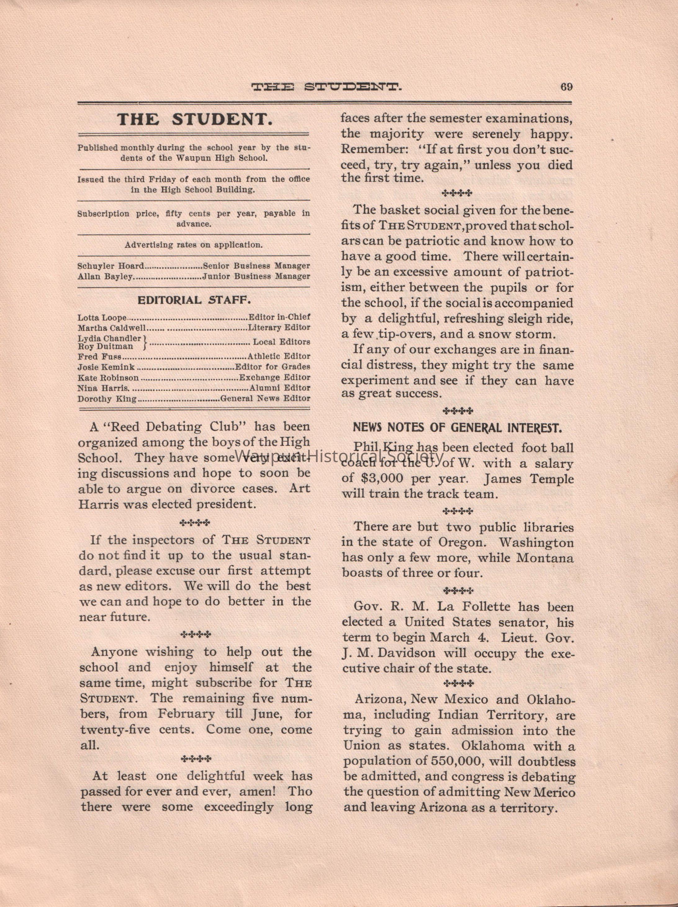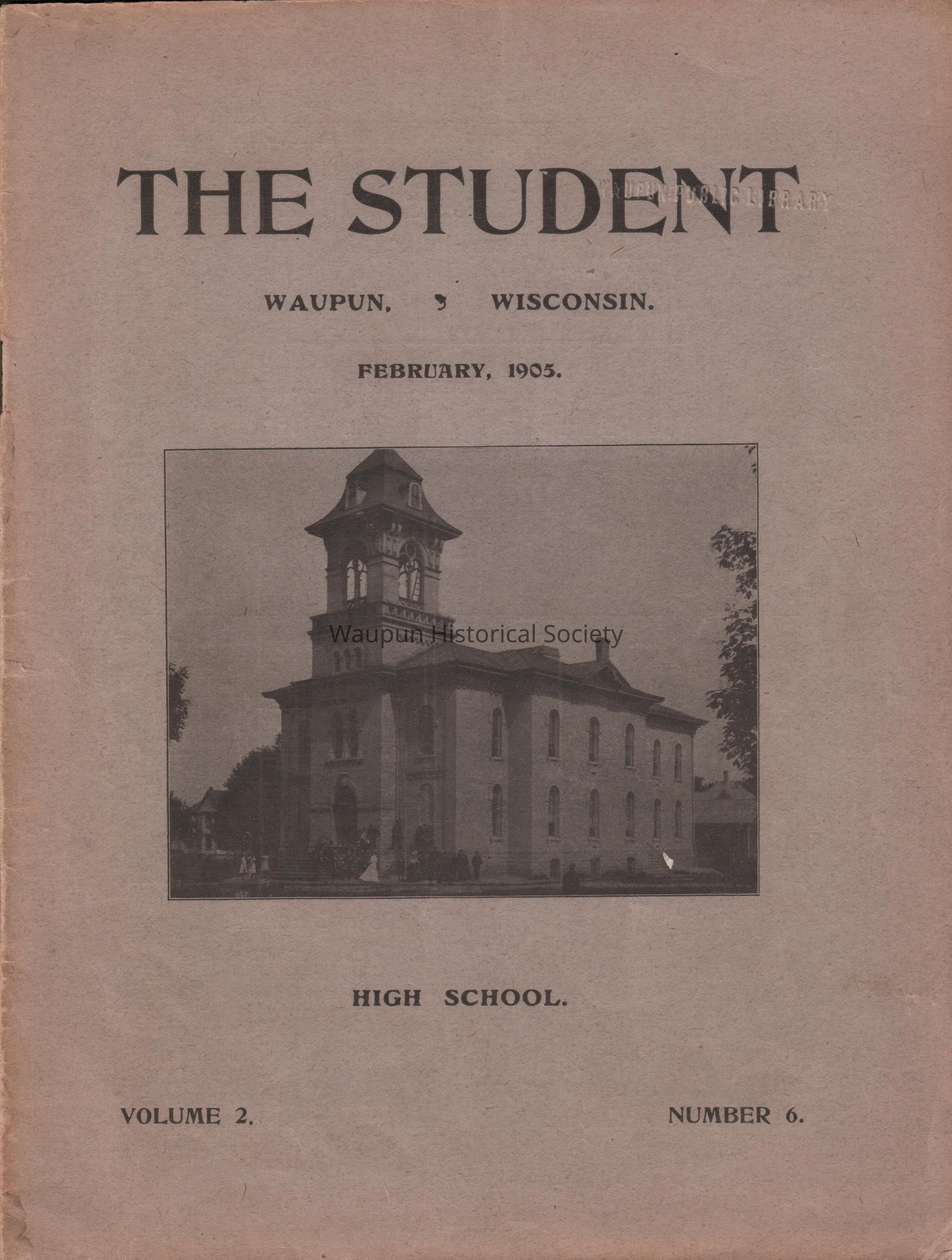monthly publication by the students of Waupun high school in Feb. 1905. tan and black cover, white pages with black print, # 65 thru 76Acquisition