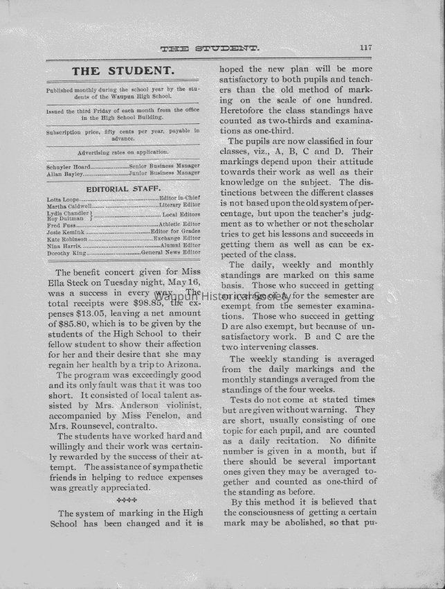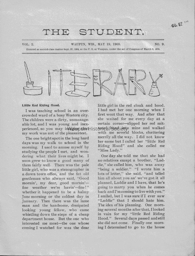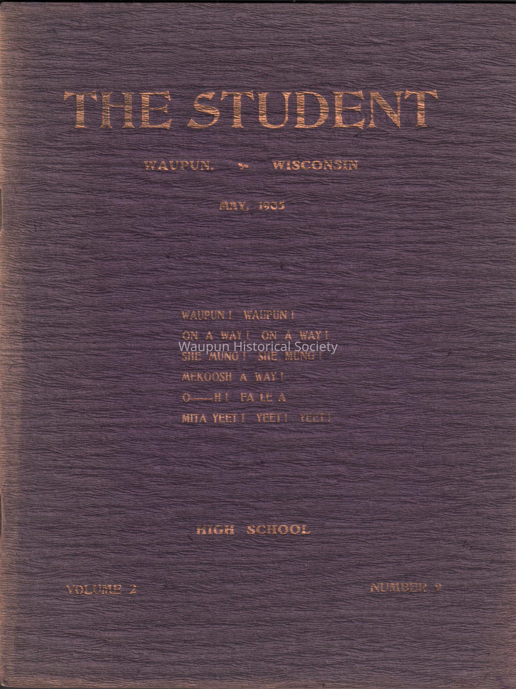 monthly publication by the students of Waupun high school in May 1905, purple cover with gold print, white pages with black print, pages 109 -124Acquisition