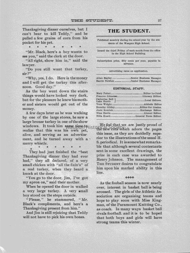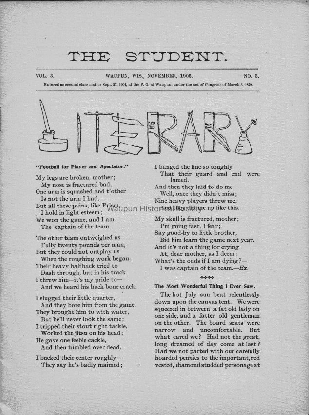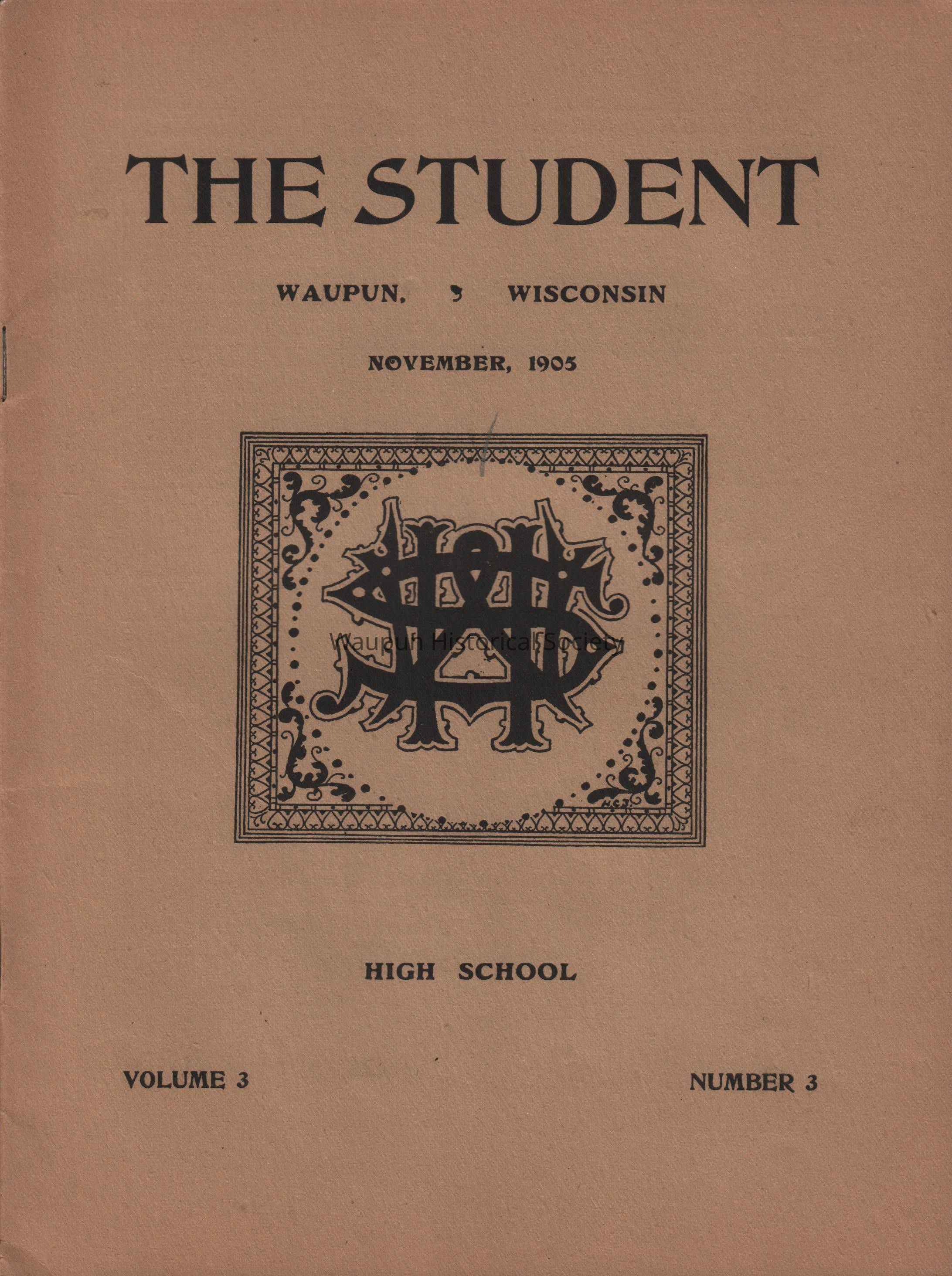 monthly publication by the students of Waupun high school Nov 1905, tan cover with black print, white pages with black printAcquisition