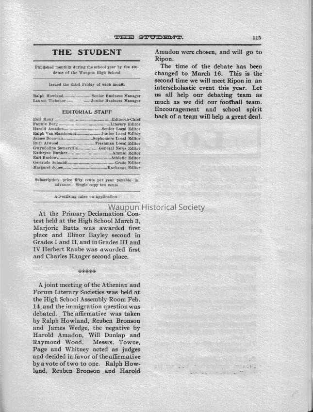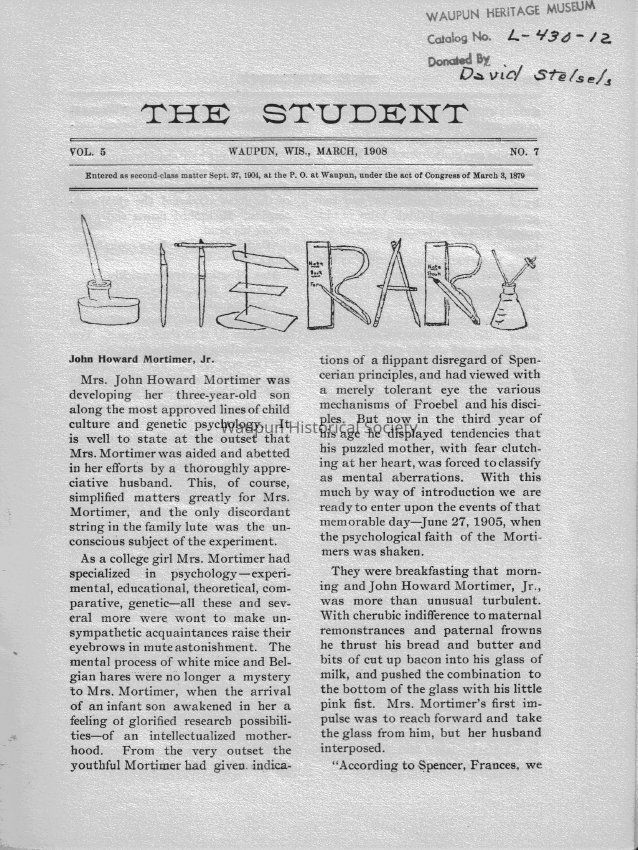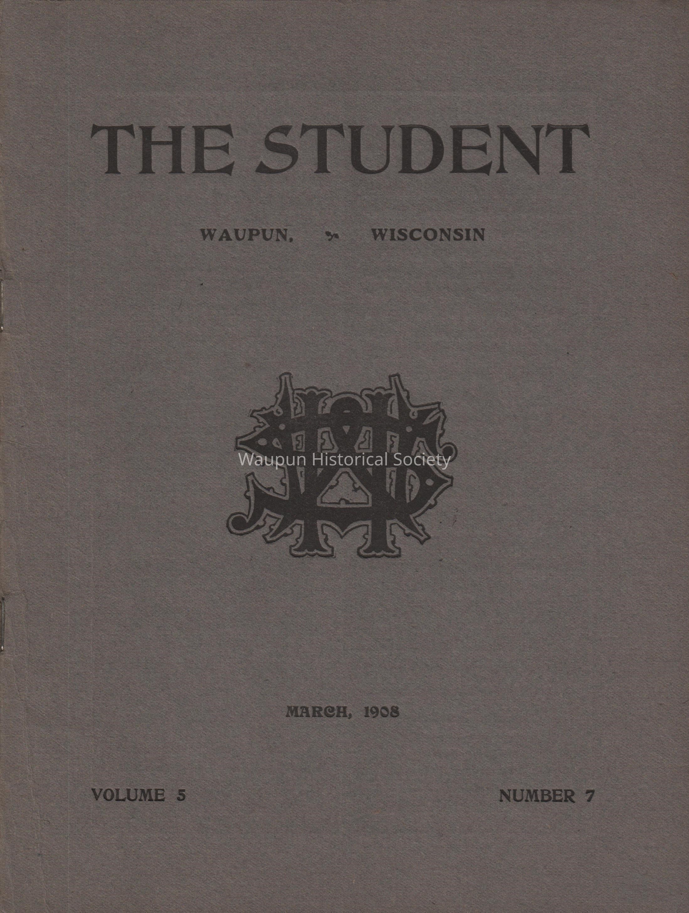 monthly publication by the students of Waupun high school in Mar 1908. gray cover with black print , white pages with black printAcquisition