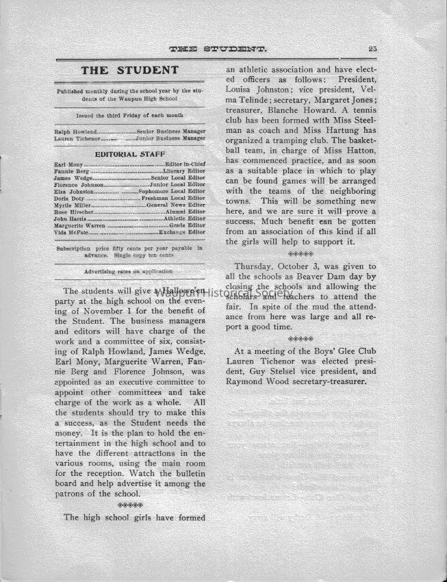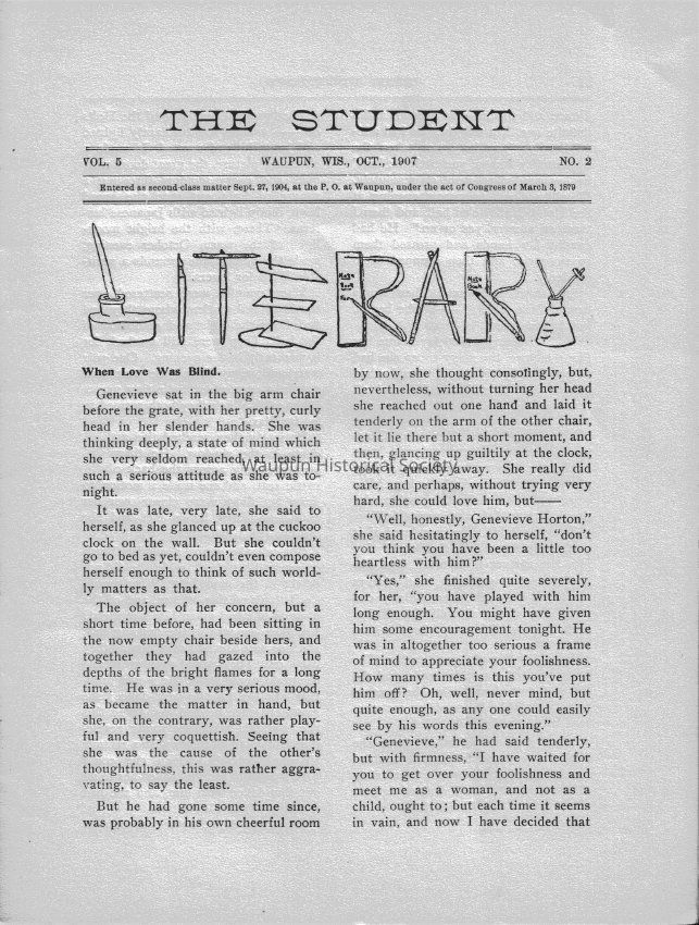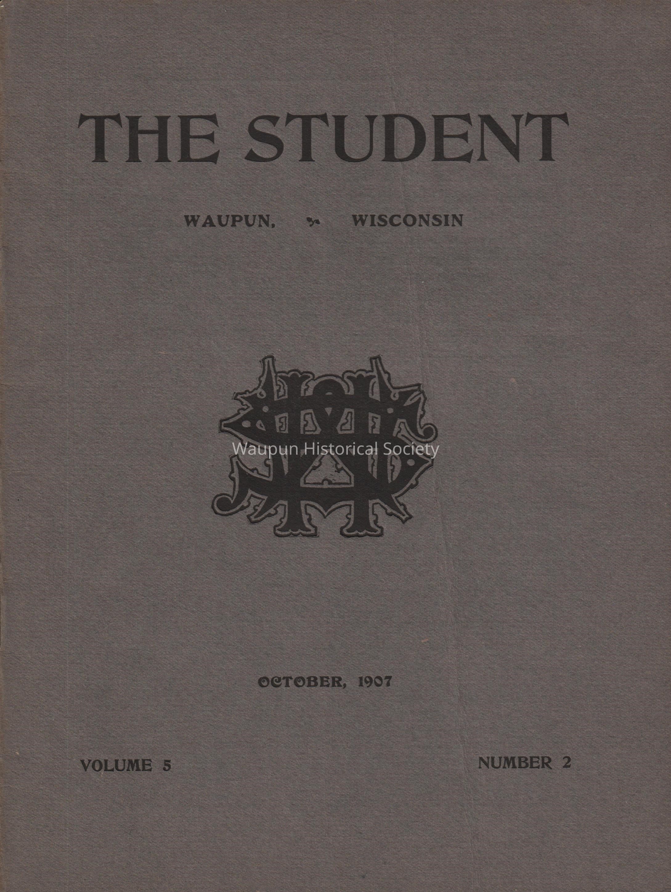 monthly publication by the students of Waupun high school Oct 1907, gray cover with black print, white pages with black printAcquisition