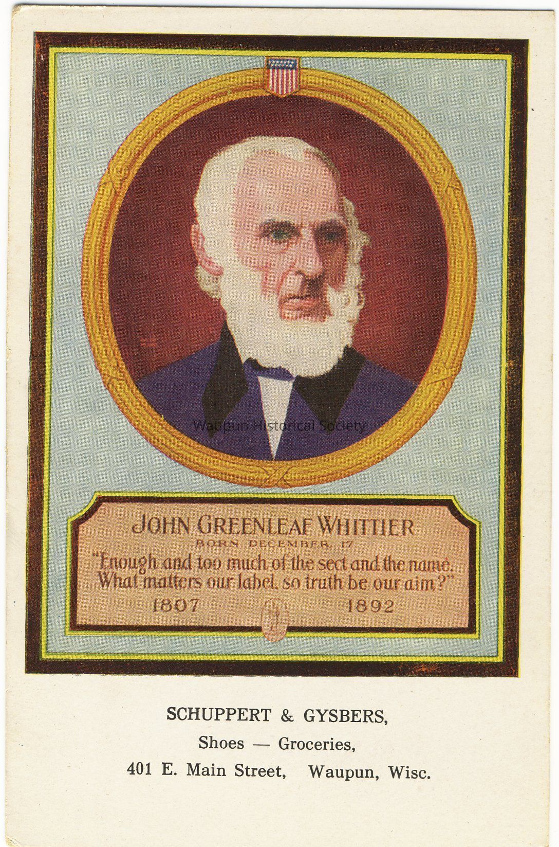 Schuppert & Gysbers, Shoes--Groceries. 401 E. Main Street, Waupun, Wisc. Postcard with John Greenleaf Whittier image and quote. Photograph published by Geo. E. Keith Company, Makers of Walk-Over Shoes, Campello, Brockton, Mass. Postcard is blank on the back. Preprinted card was probably a promotional postcard for shoes sold by Schuppert & Gysbers.