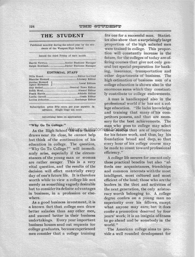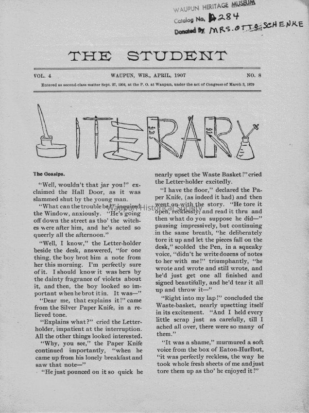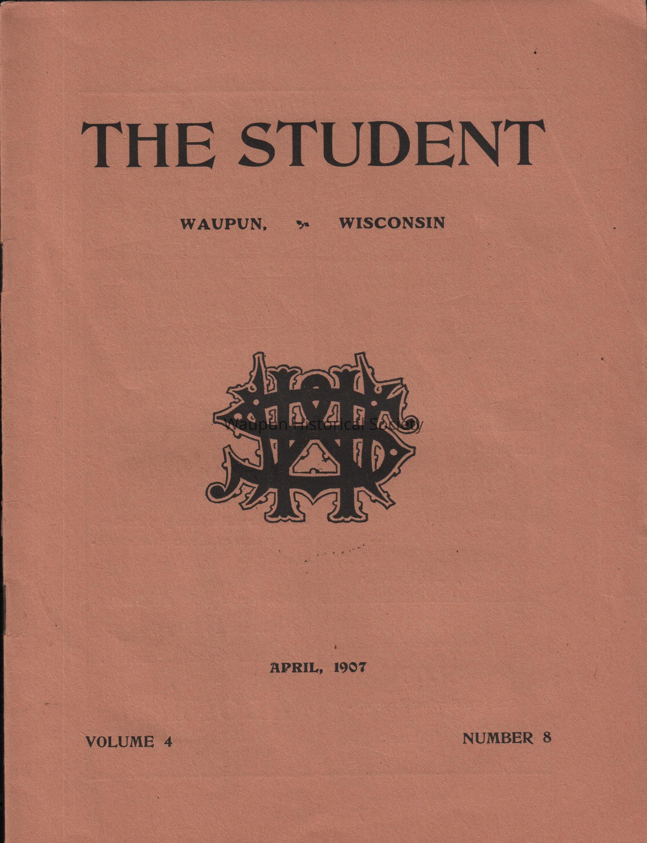 monthly publication by the students of Waupun high school in Apr.1907, Tan cover with black print , white pages with black printAcquisition