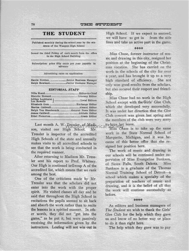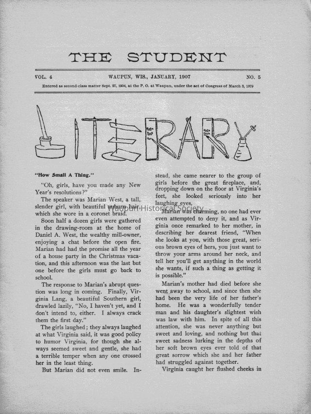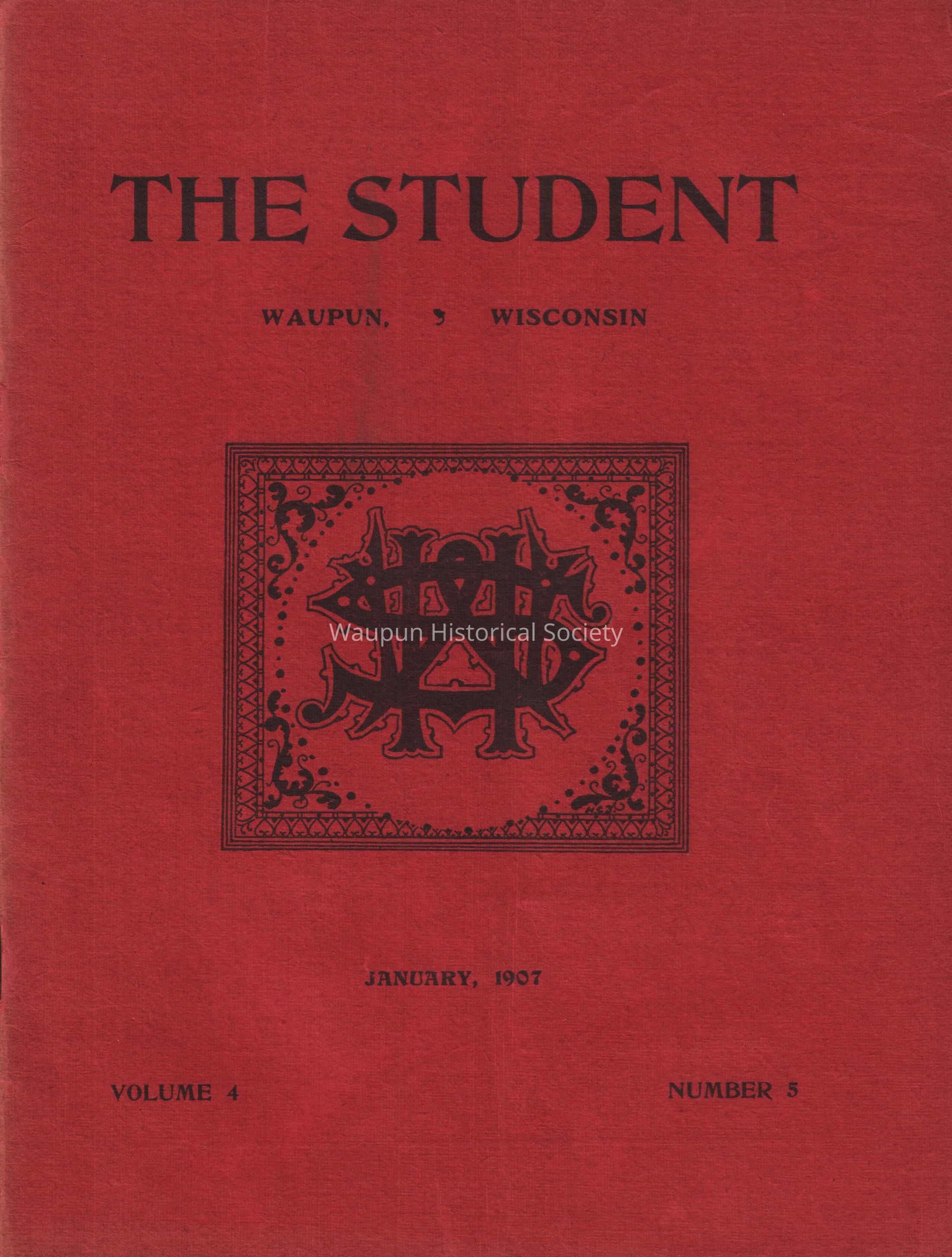 monthly publication by the students of Waupun high school in Jan 1907, cover red with black print, pages white with black printAcquisition