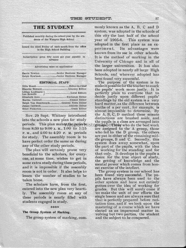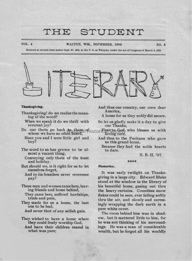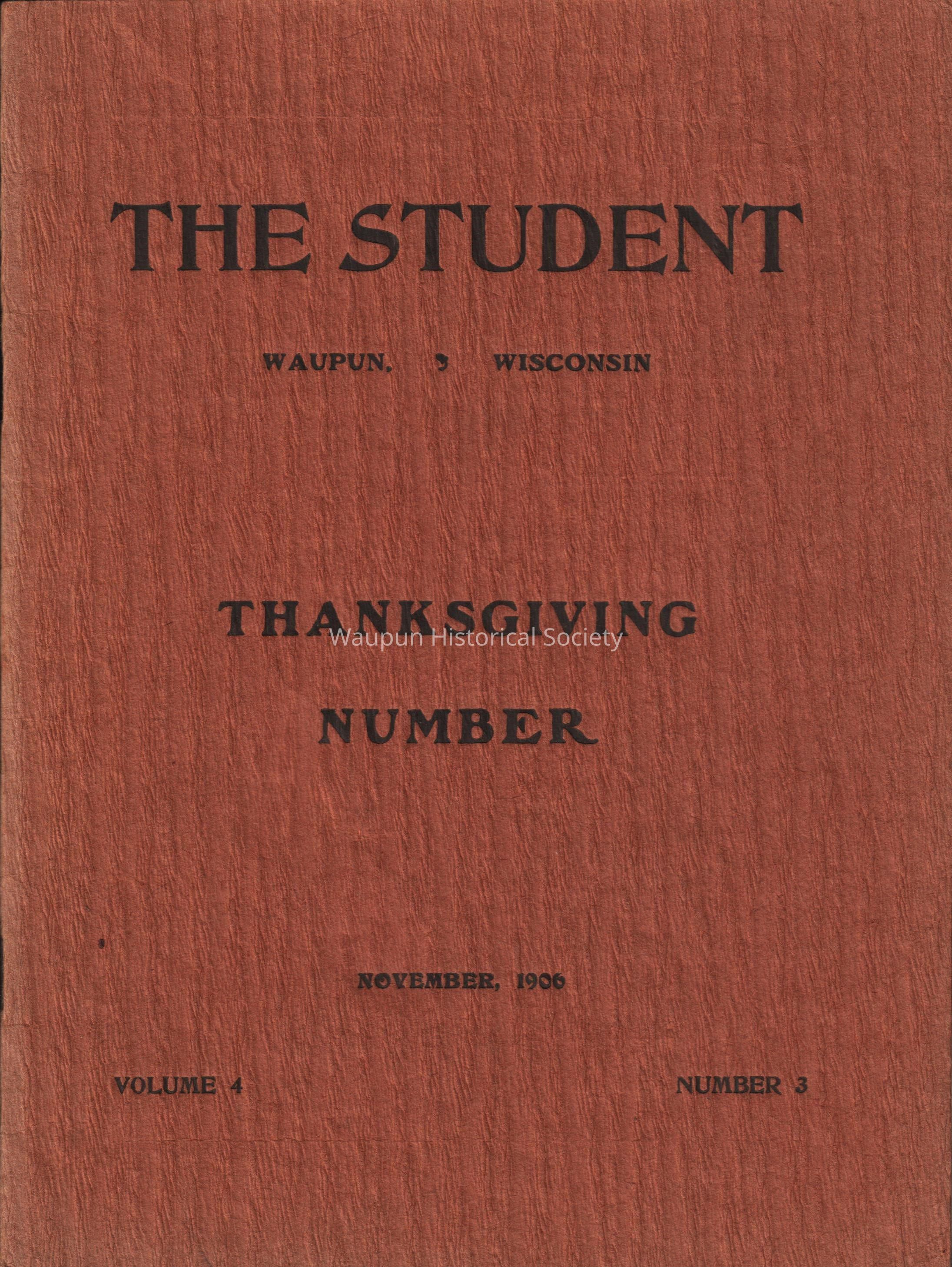 monthly publication by the students of Waupun high school in Nov. 1906, faded brown crinkle cover with black print, white pages with black printAcquisition