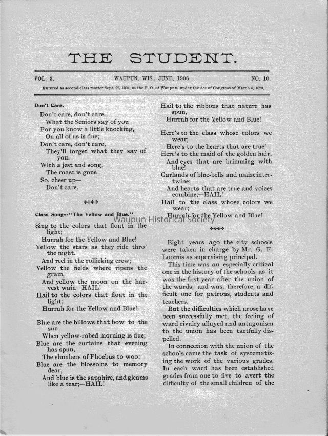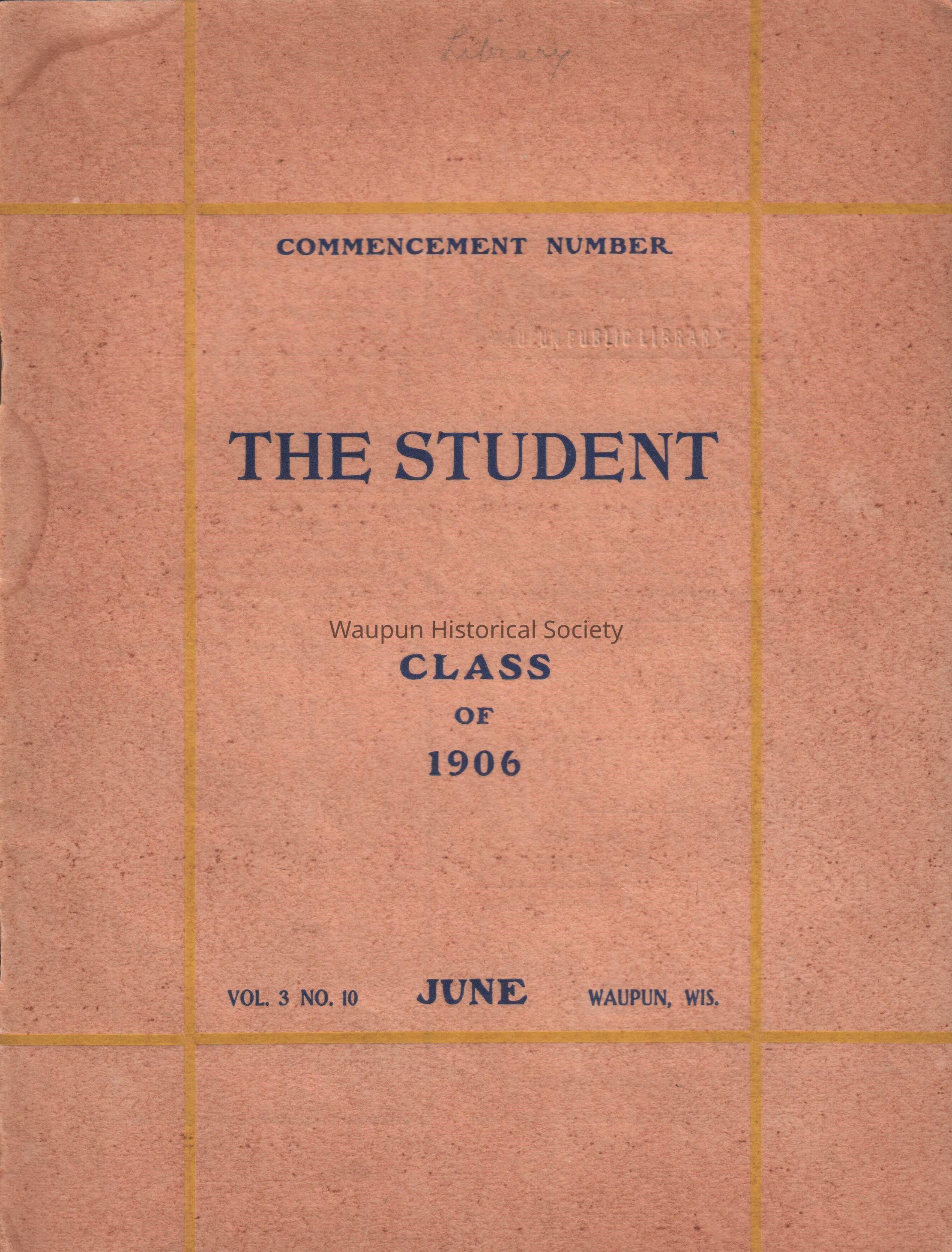 monthly publication by the students of Waupun high school in June 1906, Tan cover with yellow strips and black print, white pages with black printAcquisition