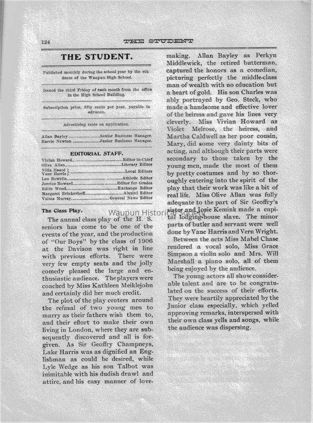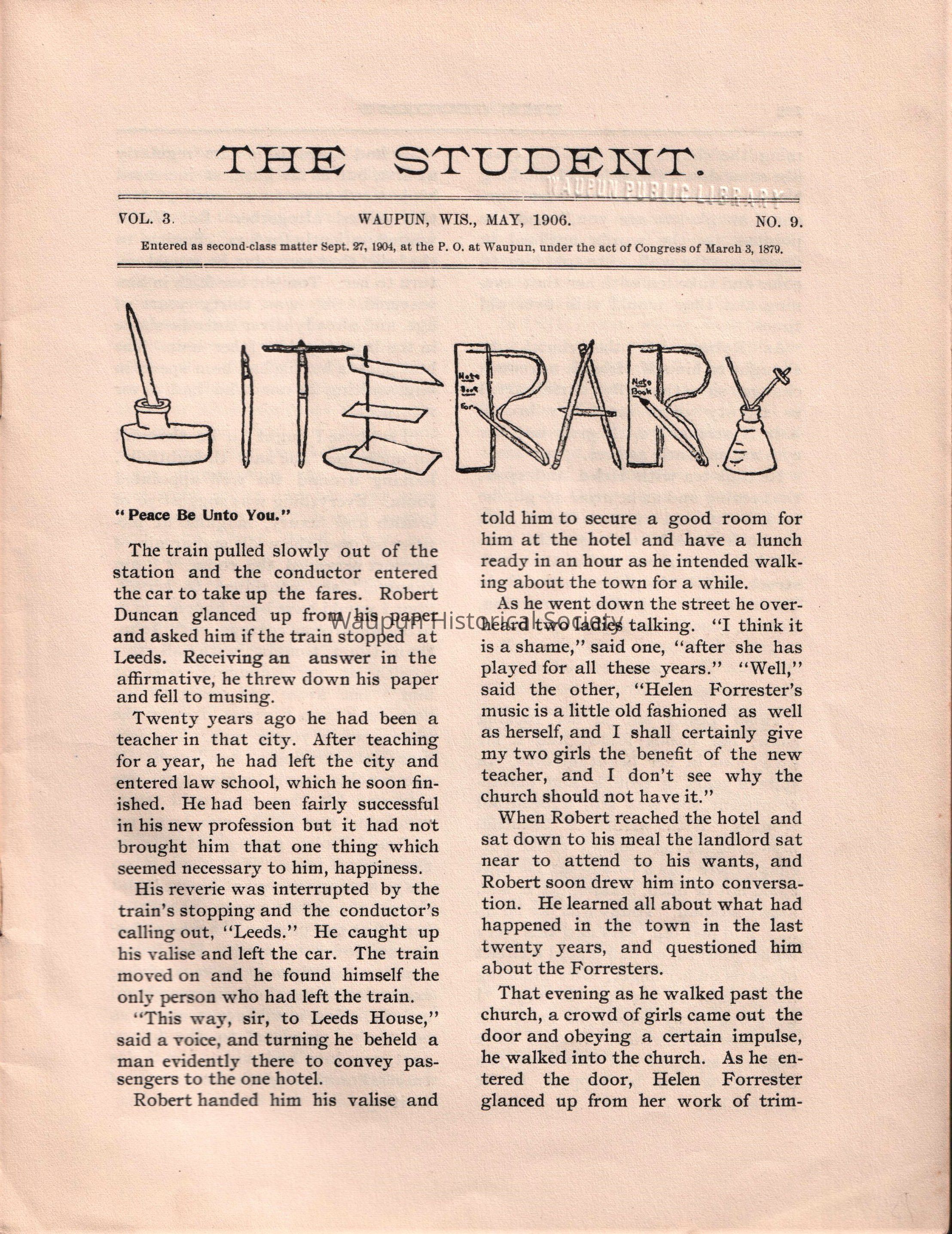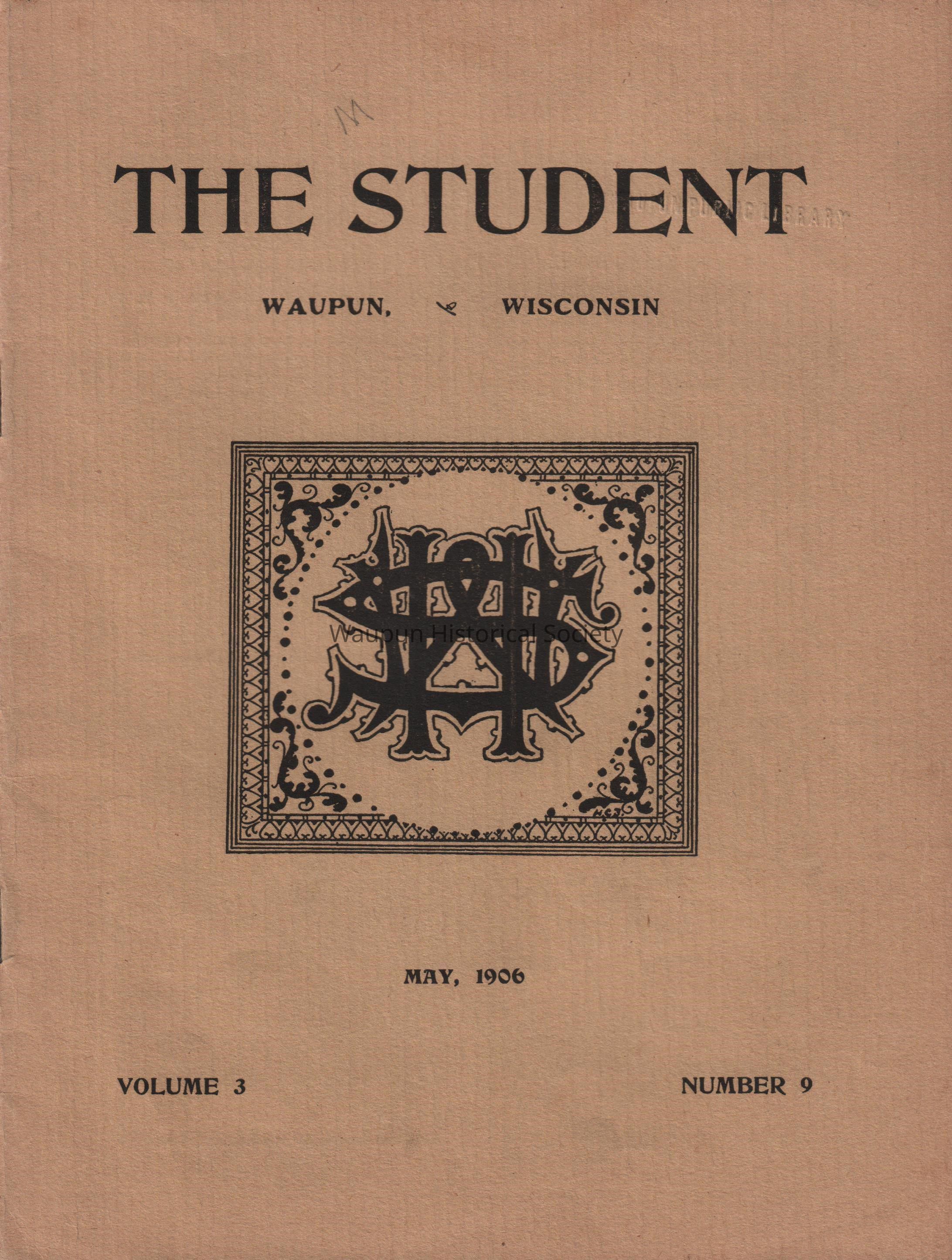 monthly publication by the students of Waupun high school in May 1906, Tan cover with black print, white pages with Black printAcquisition