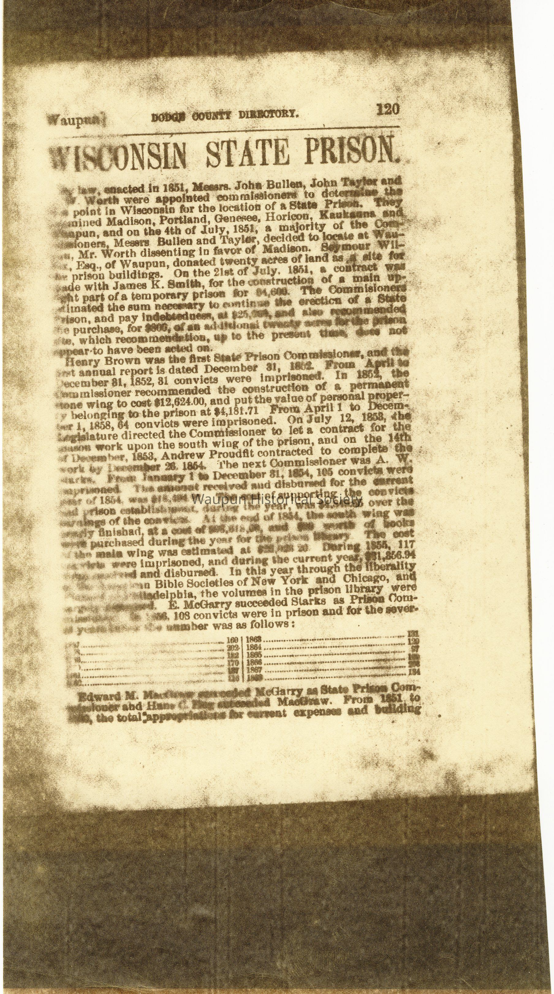 Photocopy, Corrections, Wisconsin State Prison. Wisconsin State Prison. Old photocopy from "Dodge County Directory." Page 120. By law, enacted in 1851, Messers. John Bullen, John Taylor and W. Worth were appointed commissioners to determine the (?) point in Wisconsin for the location of a State Prison. They determined Madison, Portland, Genesee, Horicon, Kaukauna and Waupun, and on the 4th of July 1851, a majority of the Commissioners, Messrs. Bullen and Taylor, decided to locate at Waupun, Mr. Worth dissenting in favor of Madison." Photocopy is of poor quality.