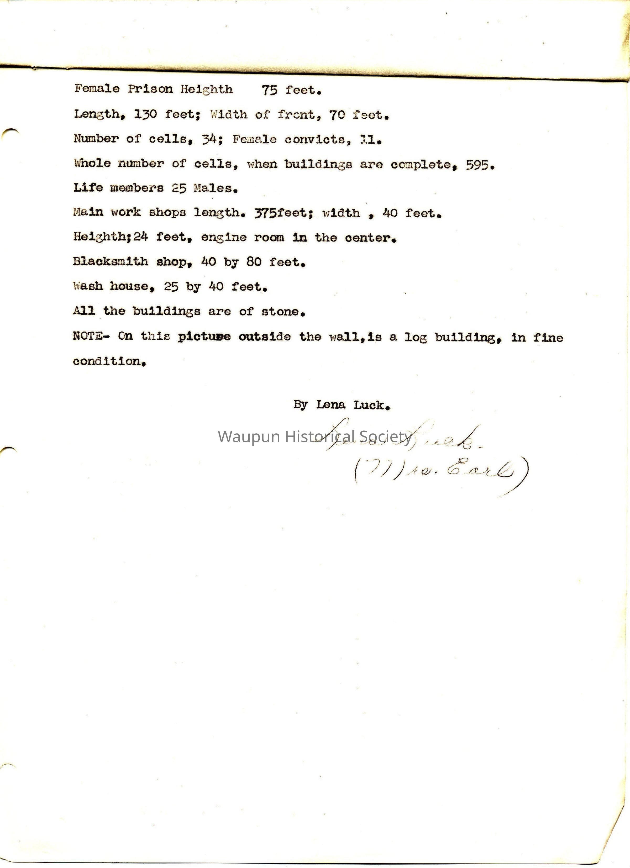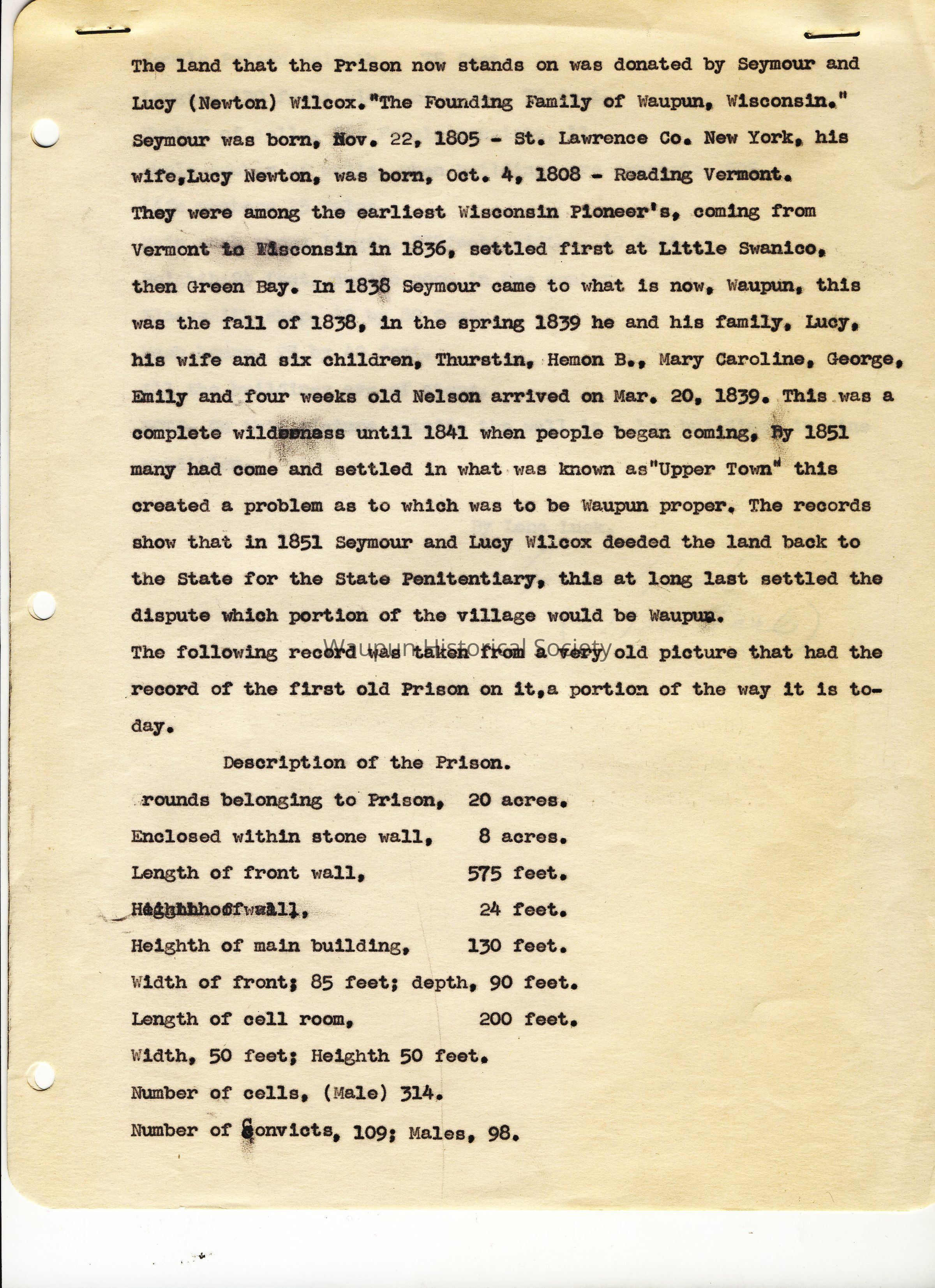 History, Corrections, Wisconsin State Prison. The land that the Prison now stands on was donated by Seymour and Lucy (Newton) Wilcox. "The Founding Family of Waupun, Wisconsin." Includes a history of the Wilcox family, children's names, "Upper" and "Lower" town controversy and a description of the prison, its dimensions and the number of cells and inmates. Taken from "a very old picture that had the record of the first old Prison on it." By Lena (Mrs. Earl) Luck. No date. There is no accompanying picture with this record.