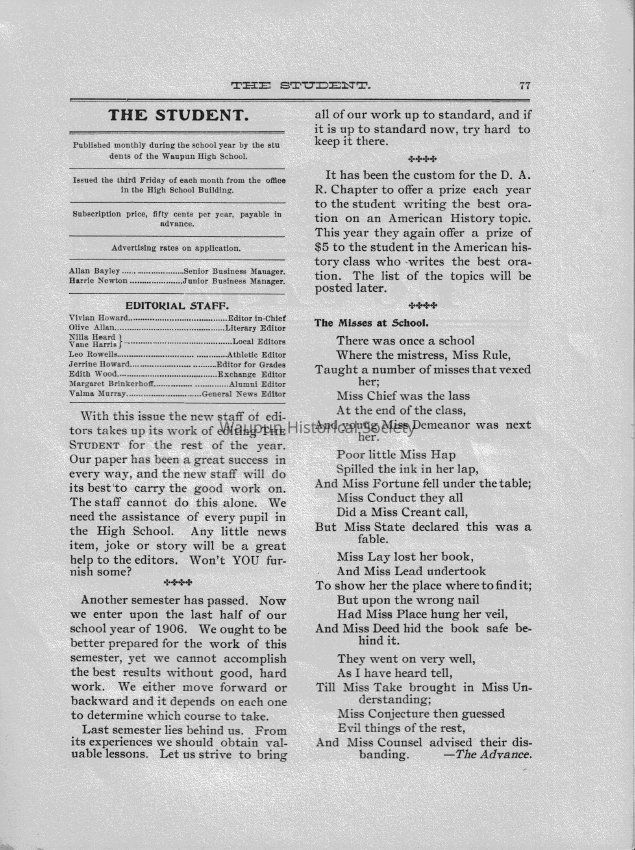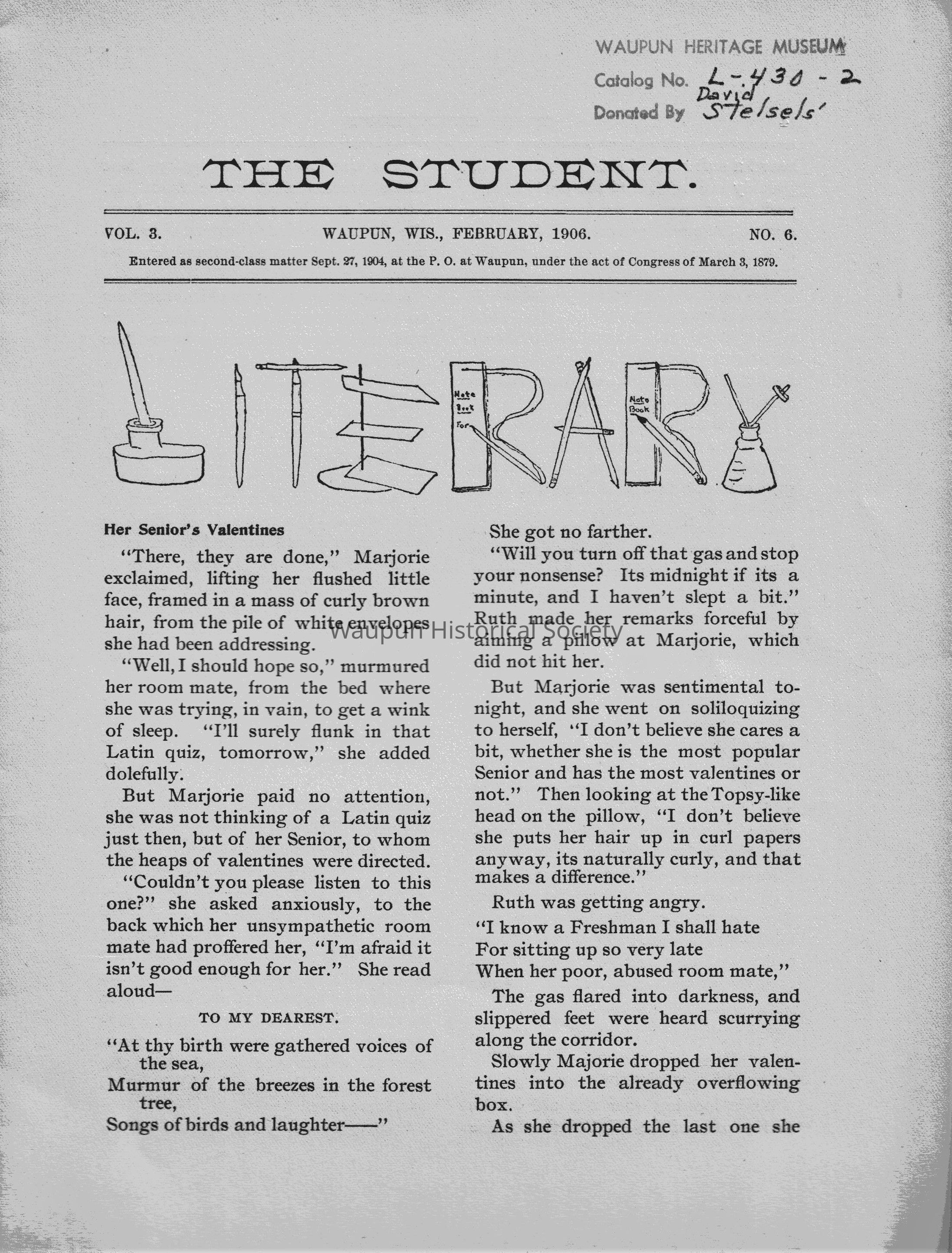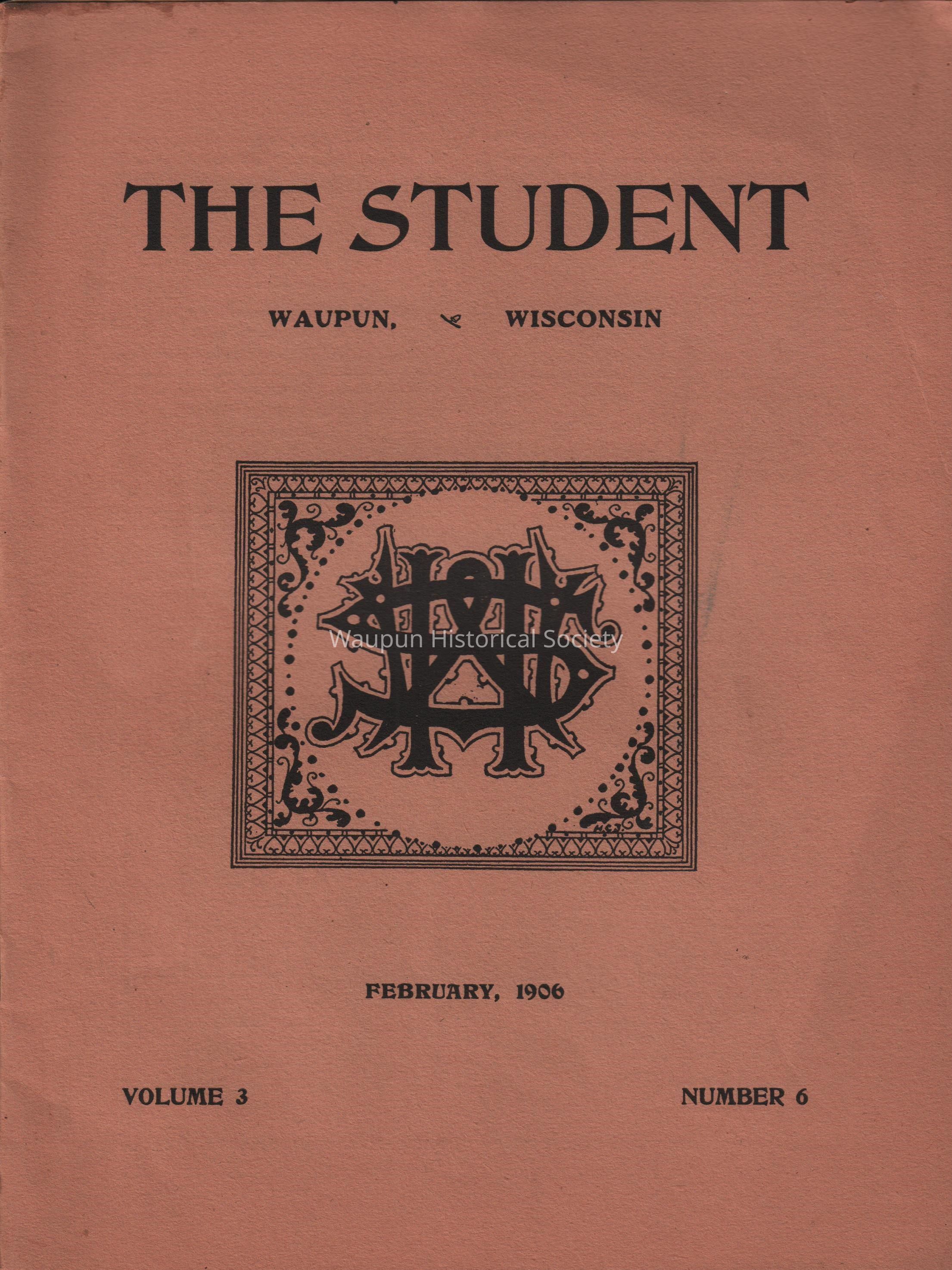 monthly publication by the students of Waupun high school inFeb. 1906, Tan cover with black print , white pages with black printAcquisition