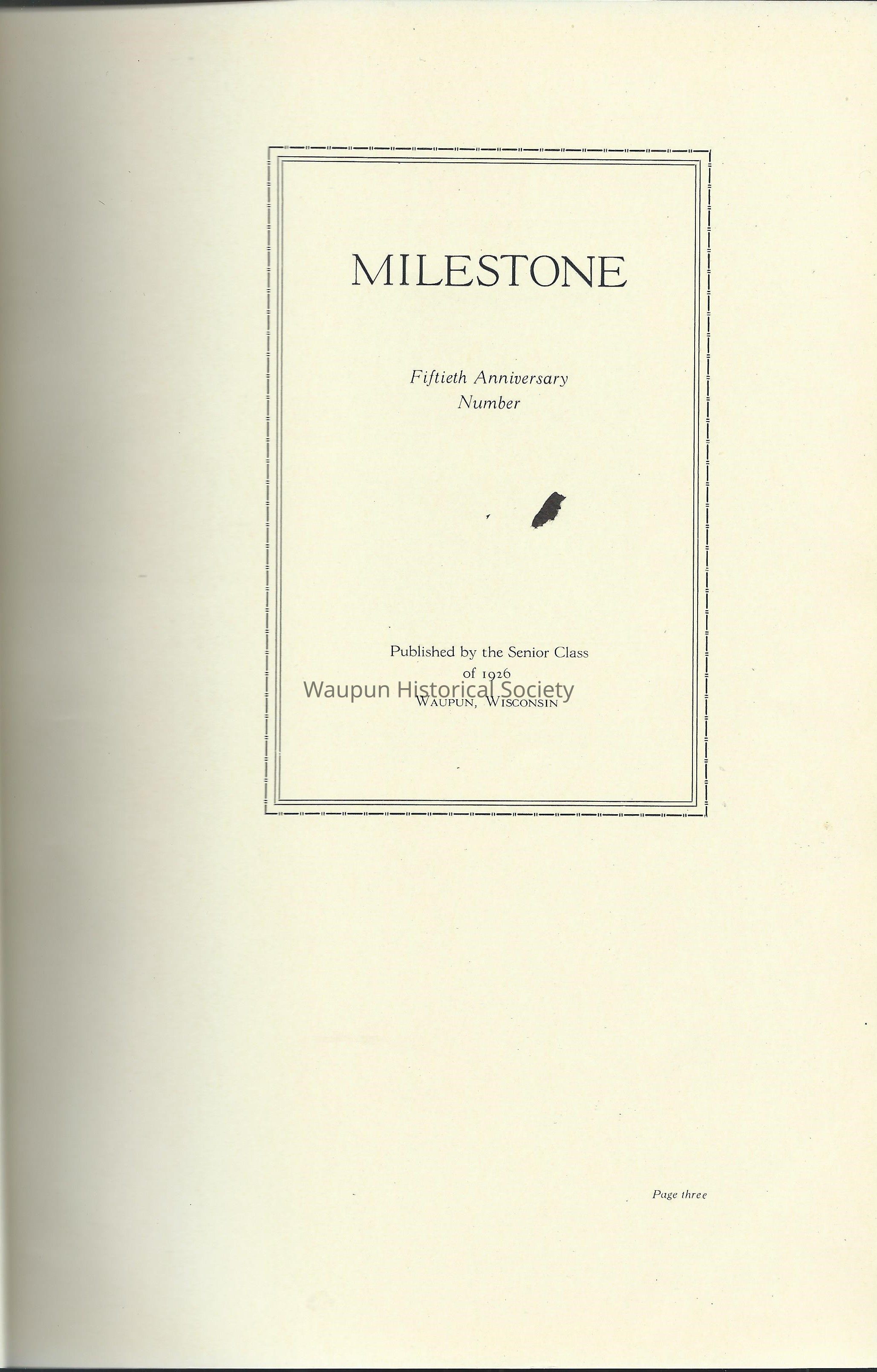 1926 Milestone, Waupun high school yearbook,Black cover white papers with black printing, 79 pages, with writing on various pagesAcquisition
