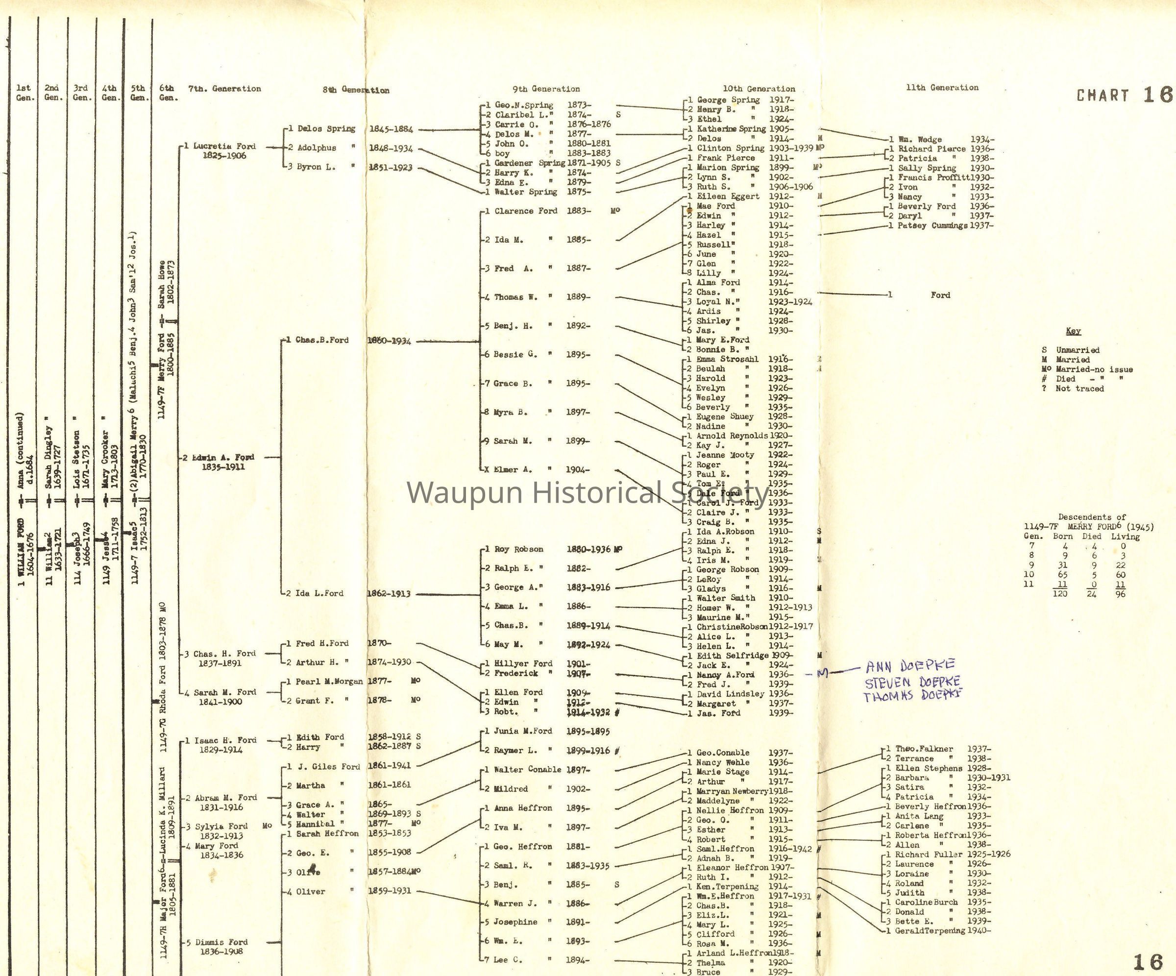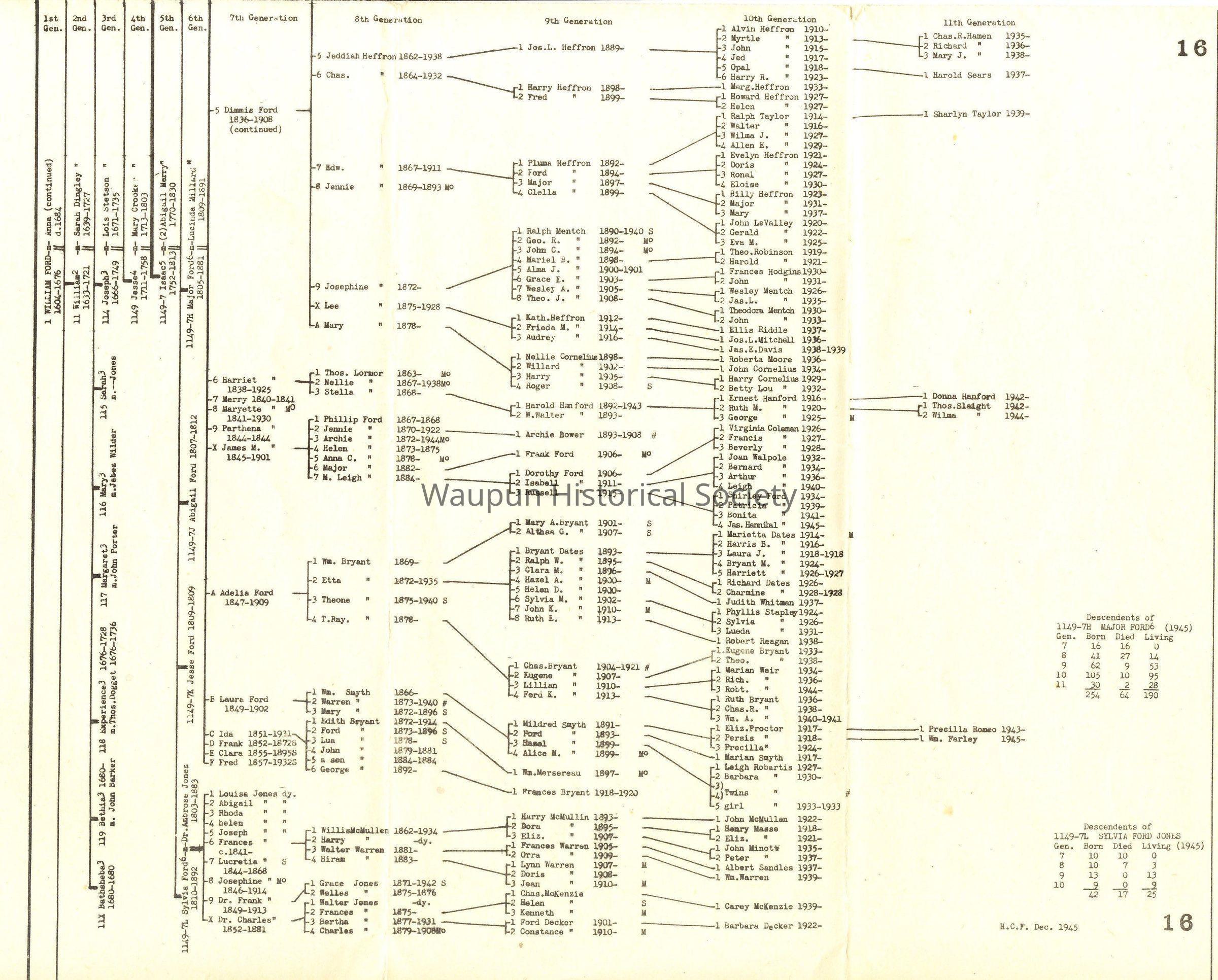 Family tree paper of Ford 1680 - 1945, 1st generation to 11th generation. This was in with the items found in home of Ted Wahlen, father of Renee Wahlen, who donated the items.Acquisition