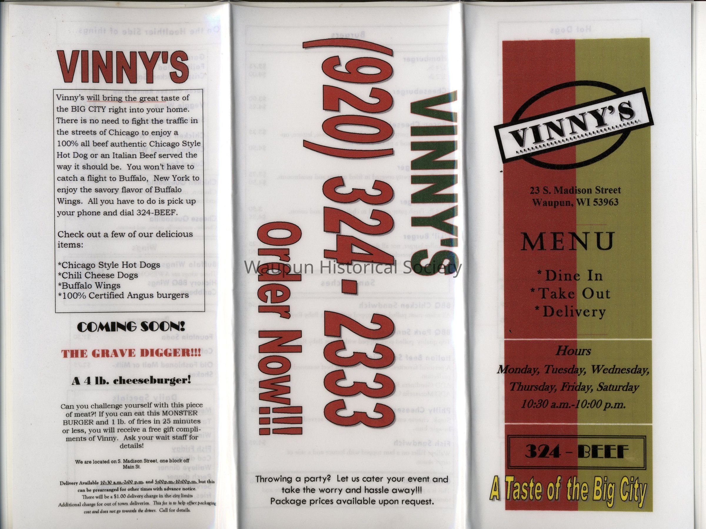 Menu: Vinny's "A Taste of the Big City." from 2005. Laminated.