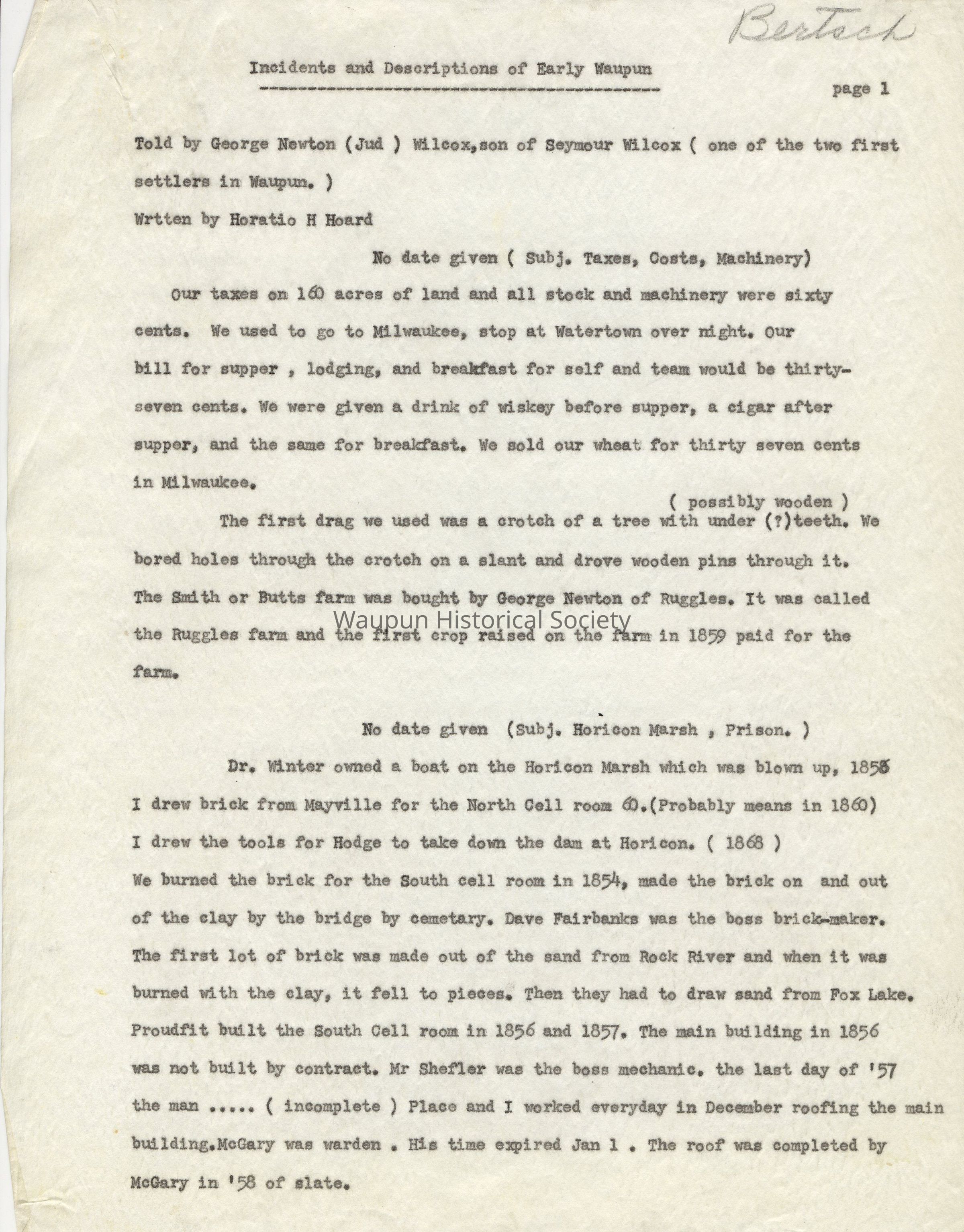 Incidents and Descriptions of Early Waupun. Told by George Newton (Jud) Wilcox, son of Seymour Wilcox (one of the first settlers in Waupun). Upper right corner written in pencil reads "Bertsch." Written by Horatio H. Hoard. Page 1.