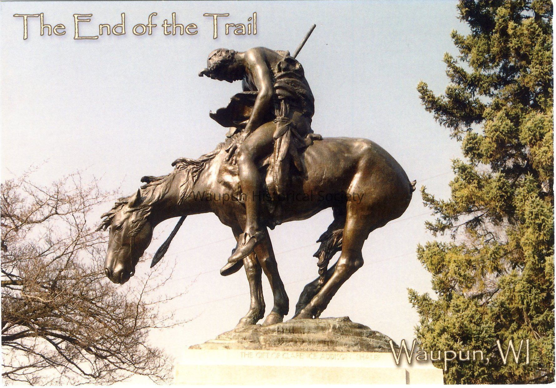 Postcard The End of the Trail. Description typed on back as follows: Created as a tribute to the American Indian by James Earle Fraser (1876-1953) when only 17. His twice life-sized plaster replica gained world fame at the 1915 San Fancisco Exposition. Clarence Shaler, Waupun Inductrialist, commissioned this first bronze casting. Dedication was June 23, 1929. Chief John Big Tree, Fraser's model, was the honored guest at Waupun's 125th Jubilee July 1-4, 1964.