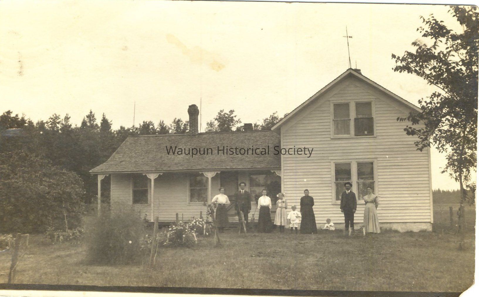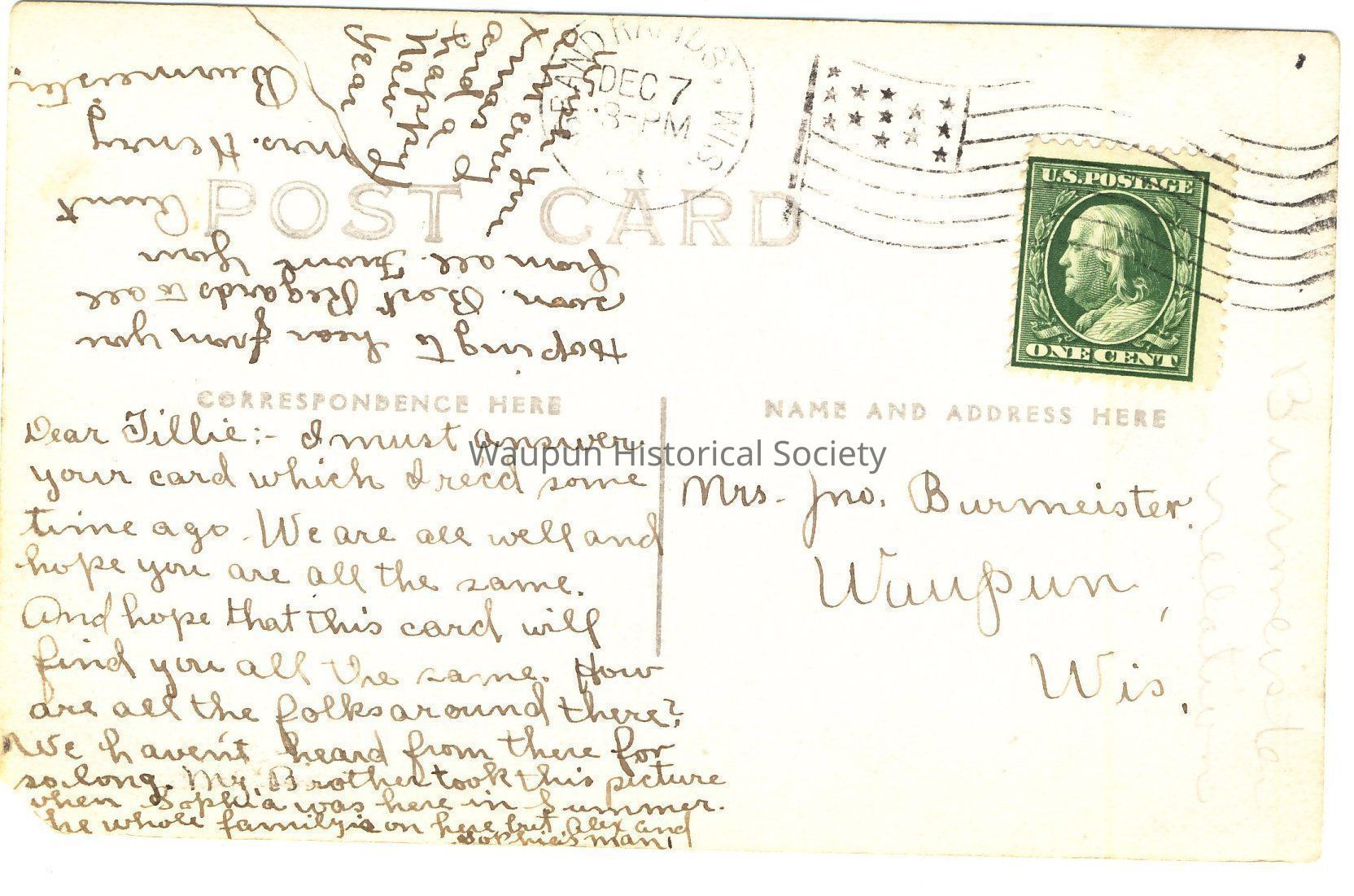 Postcard, Houses, Burmeister Farm Home. Photo of Henry Burmeister farm home on a postcard with people in front. Postcard addressed to Mrs. Jno. Burmeister, Tillie, Waupun, Wis. from Mrs. Henry Burmeister (Aunt). As indicated in the note on the postcard, this was taken in the summer time. This from the collection of photos donated by William and Joyce Burmeister.Acquisition