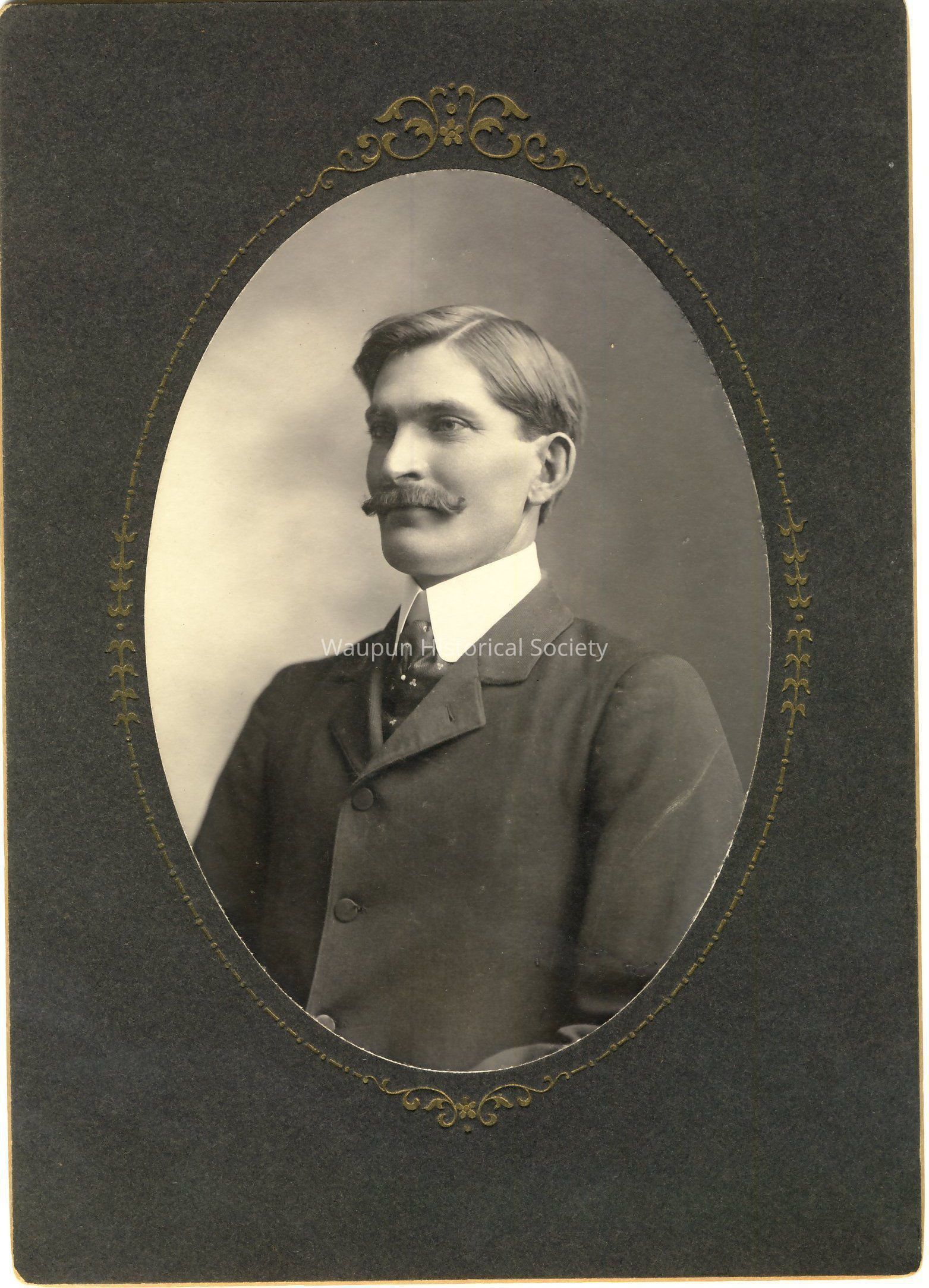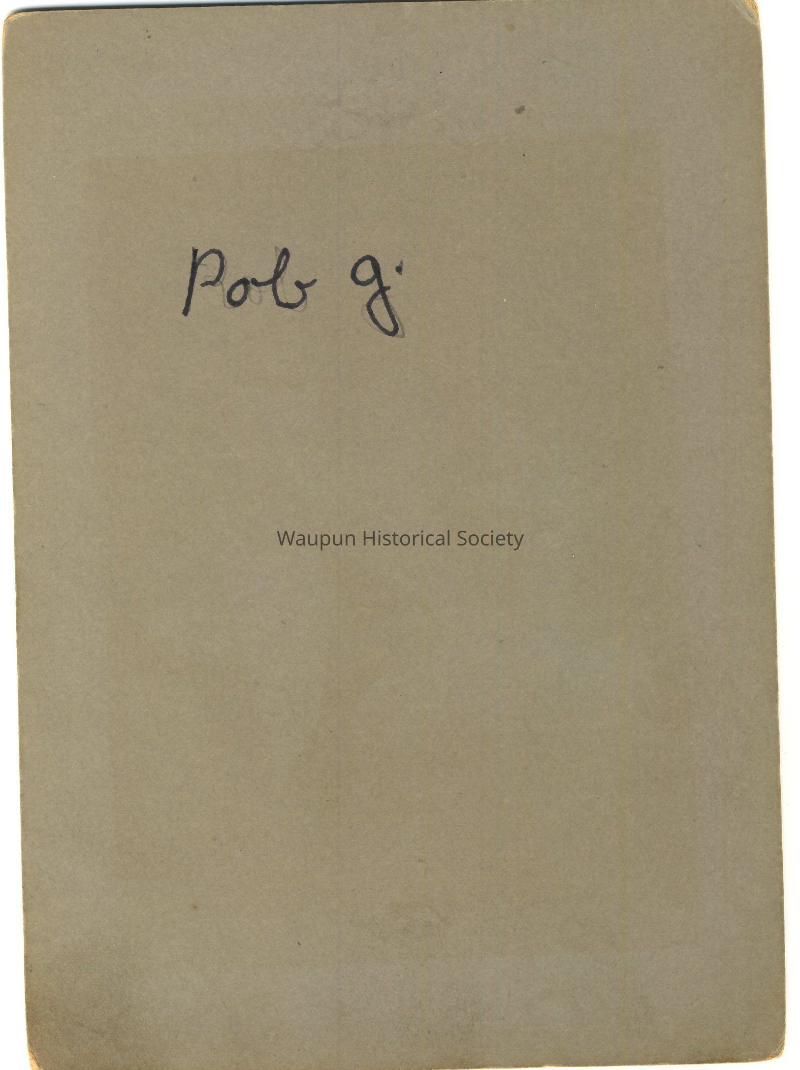 Portrait, Rob G. The front is a black background with a decorative gold floral trim encircling the picture. Thiis from the collection of photos donated by William and Joyce Burmeister.Acquisition