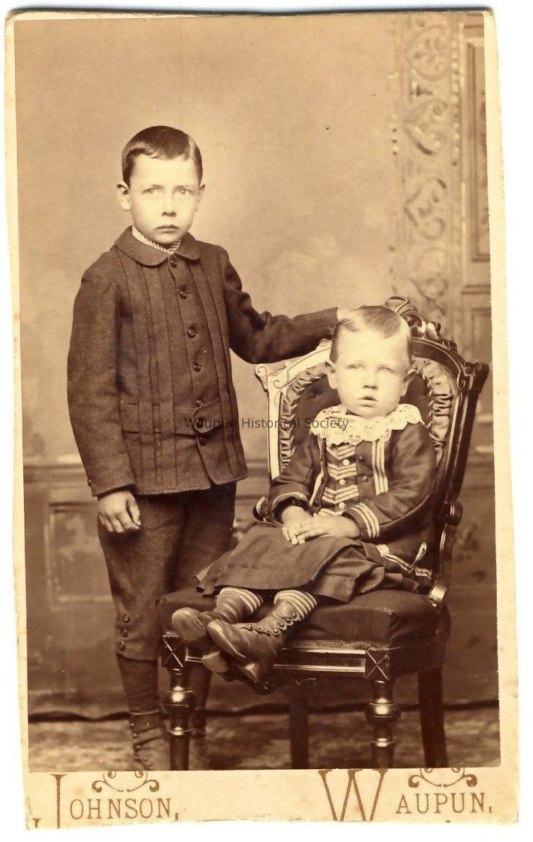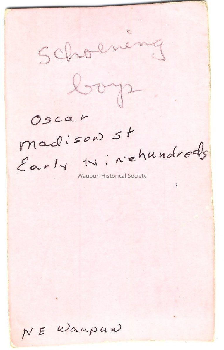 Cabinet Card, Johnson, Small, Photo of Schoening boys - Oscar, Madison St., early ninehunreds (nineteenhundreds?), NE Waupun is hand written on back of photo. This is from the collection of photos donated by William and Joyce Burmeister.