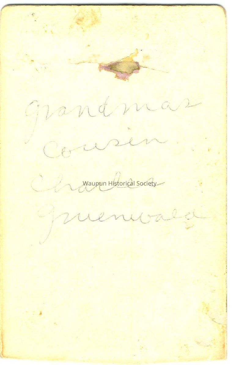 Cabinet Card, Johnson, Small, Photo of Charles Gruenwald as indicated on back of photo; "Grandma's cousin, Charles Gruenwald" is hand written. This is photo from the collection from William and Joyce Burmeister.Acquisition