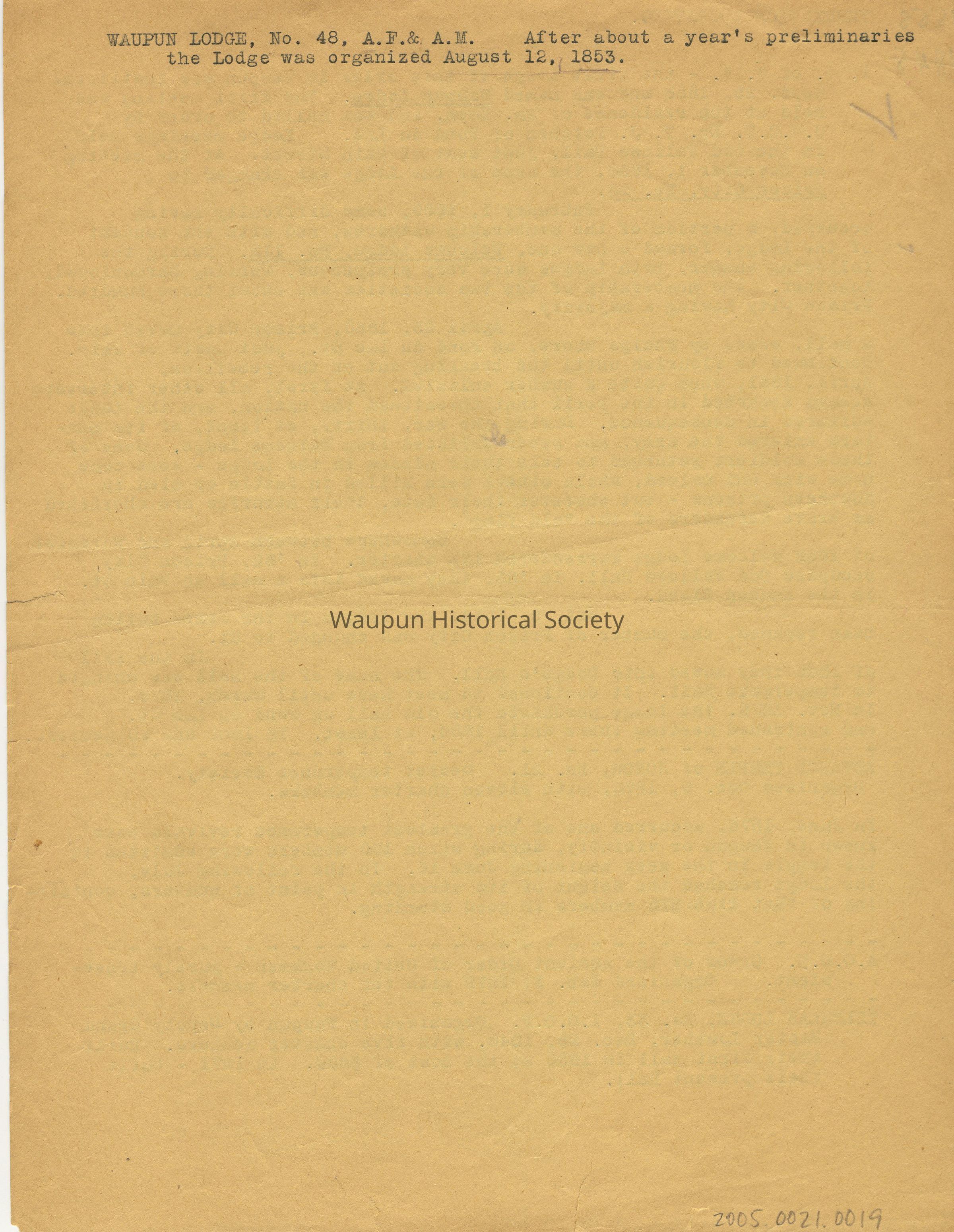 Back of sheet: Waupun Lodge, No. 48, A.F. & A.M. After about a year's preliminaries, the Lodge was organized August 12, 1853.