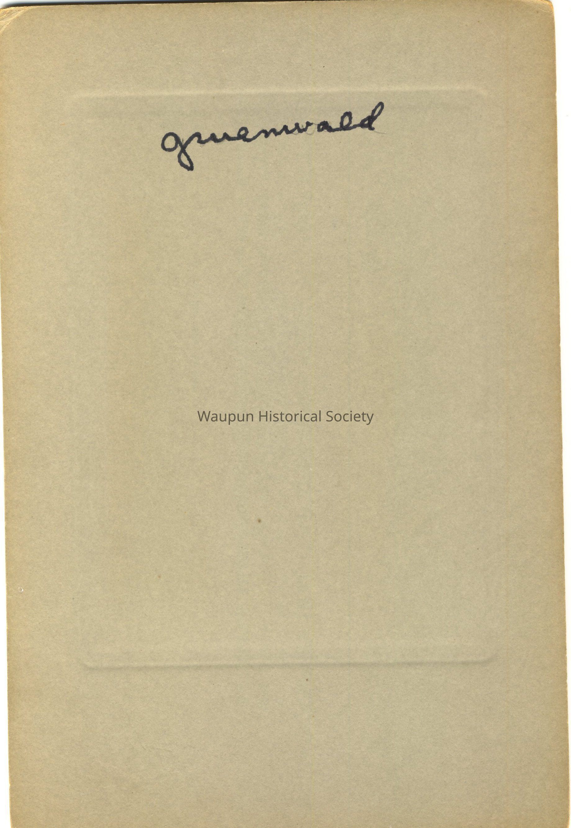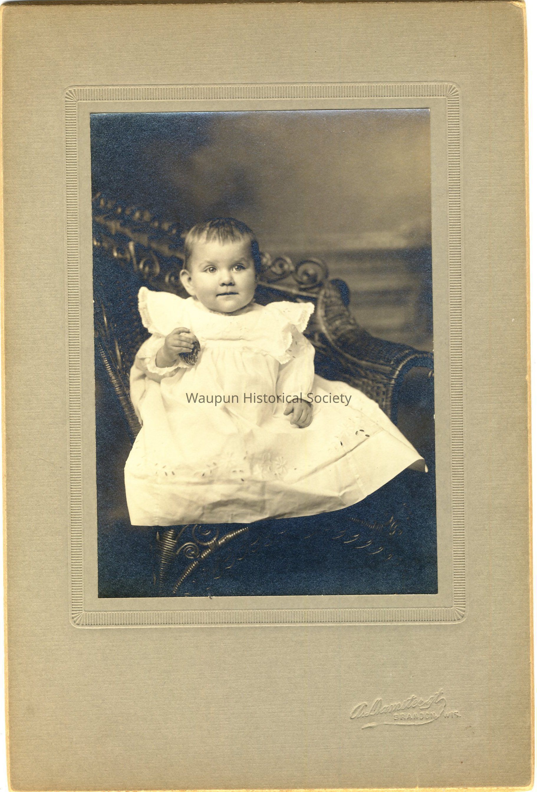 Portrait, Gruenwald baby, as indicated in hand writing on back of photo. Paper frame indicates this is from A. Damitec photo studio of Crandon, Wis. This is from the collection of photos donated by William and Joyce Burmeister.Acquisition