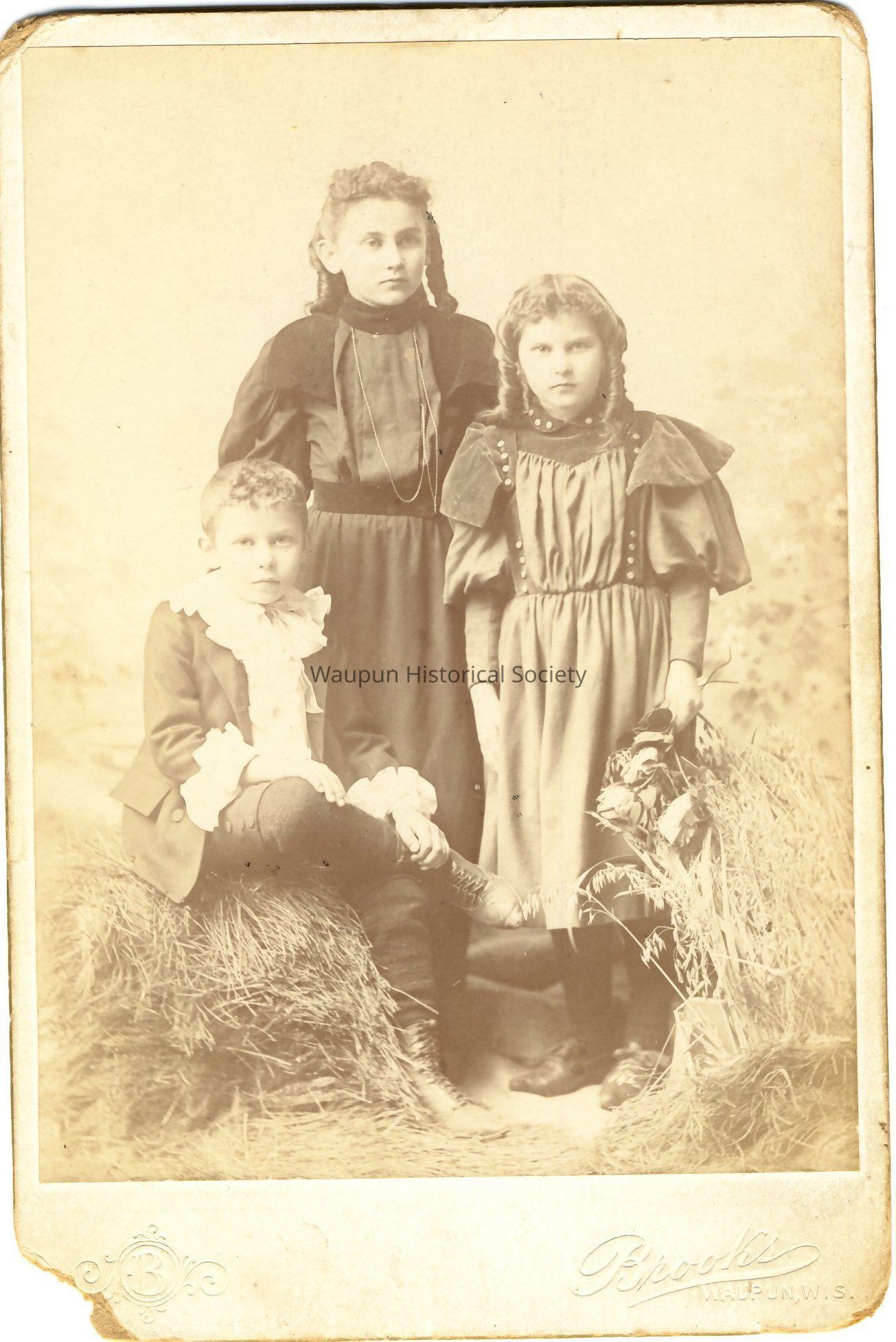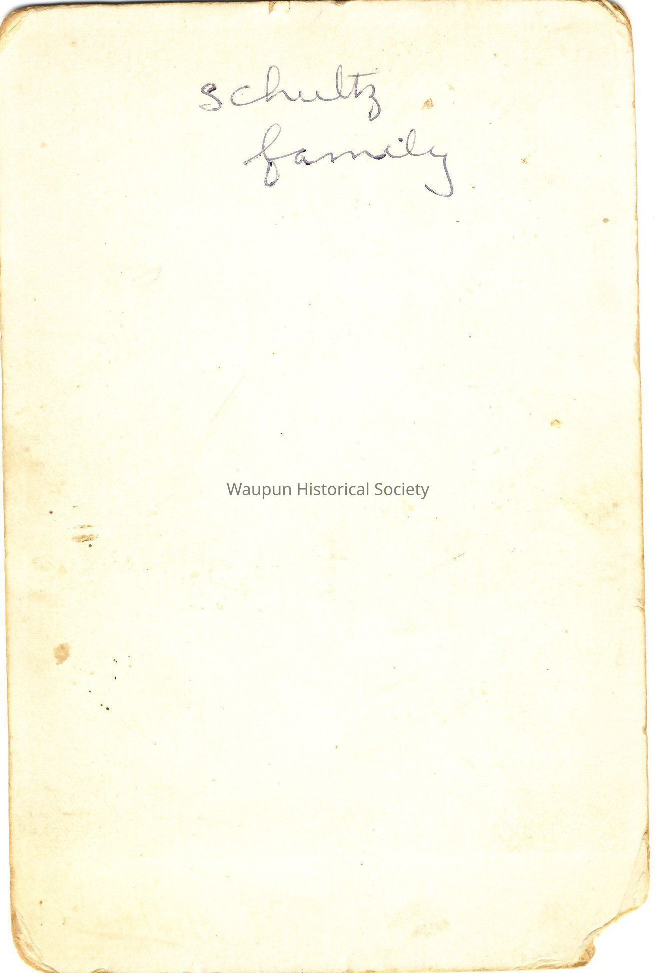 Cabinet Card, Brooks, Photo of Schultz family as indicated in hand writing on back of photo. This is from the photo collection donated by Willaim and Joyce Burmeister. Appears that there are 2 girls standing and a boy sitting.Acquisition
