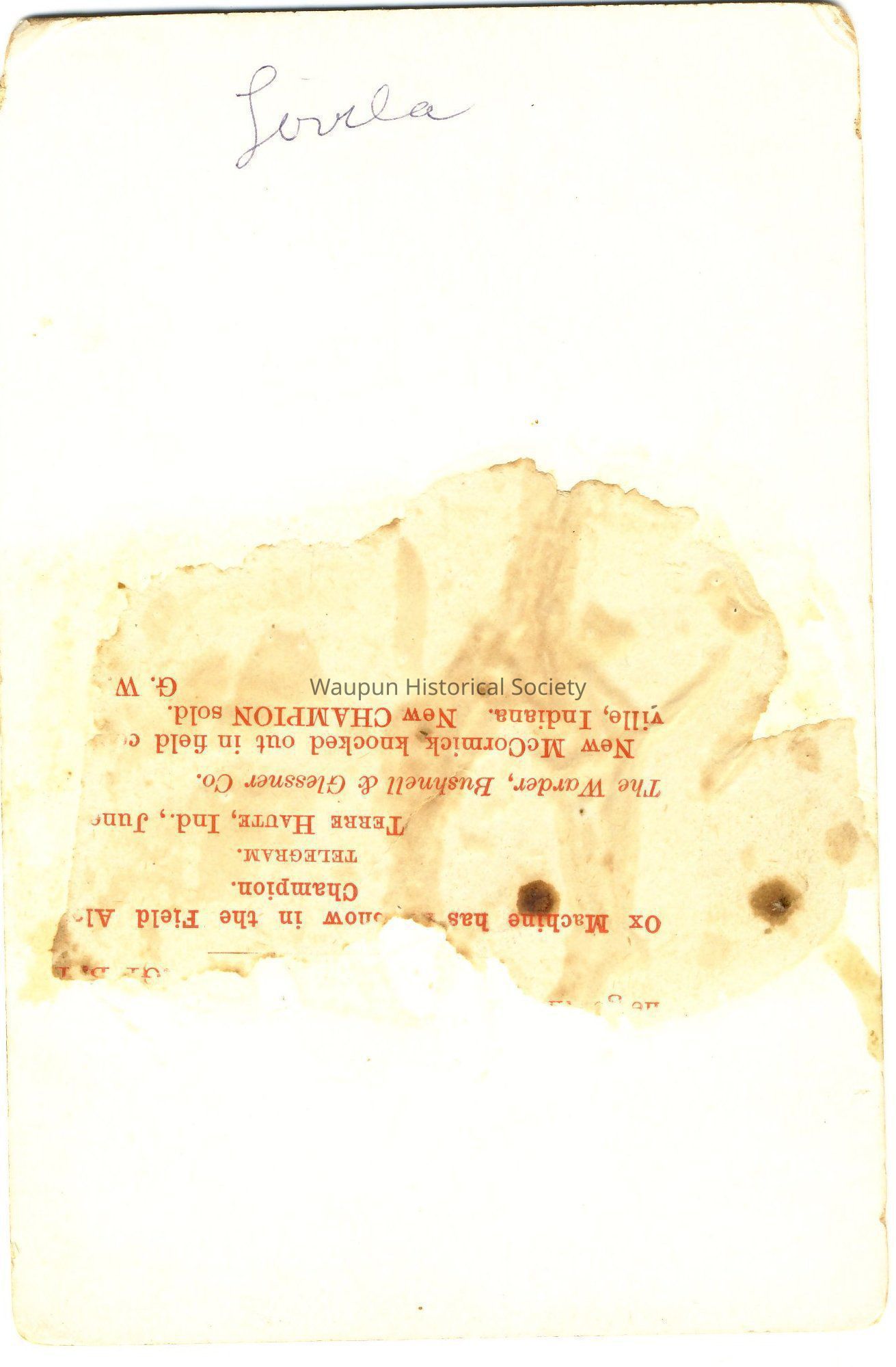 Cabinet Card, Johnson, Back of this photo indicates that this is Lovila. This is from the collection donated by William and Joyce Burmeister.