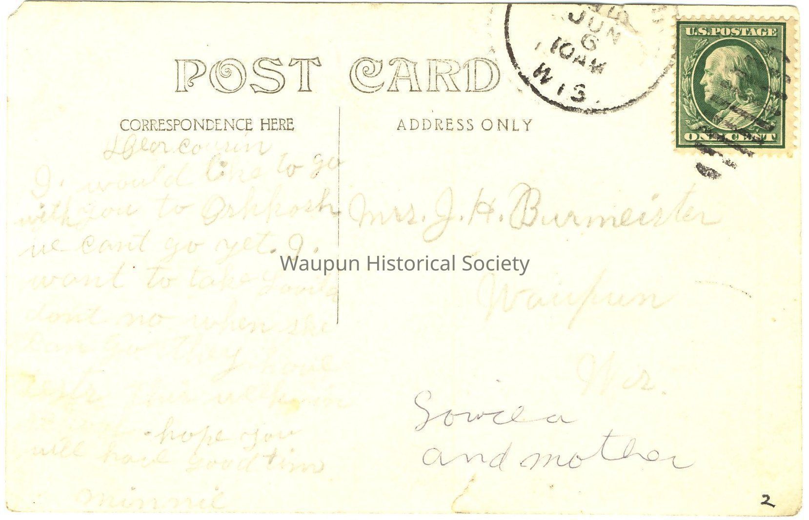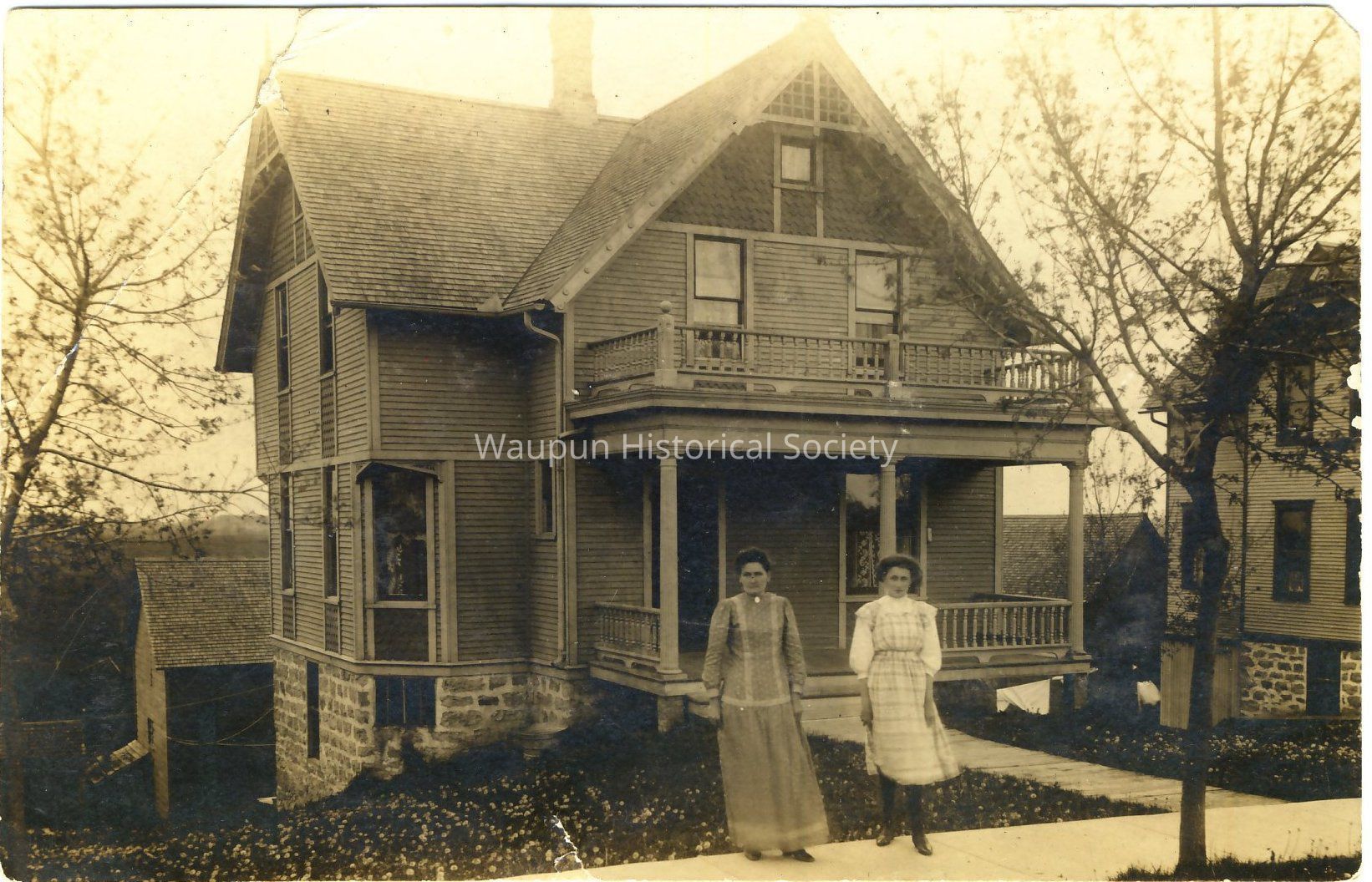 Postcard, Houses, Lovila and Mother, Burmeister. Photo postcard of Lovila and her mother (Minnie) in front of their home, addressed to Mrs. J. H. Burmeister, Waupun, Wis. This is from the collection donated by William and Joyce Burmeister.Acquisition