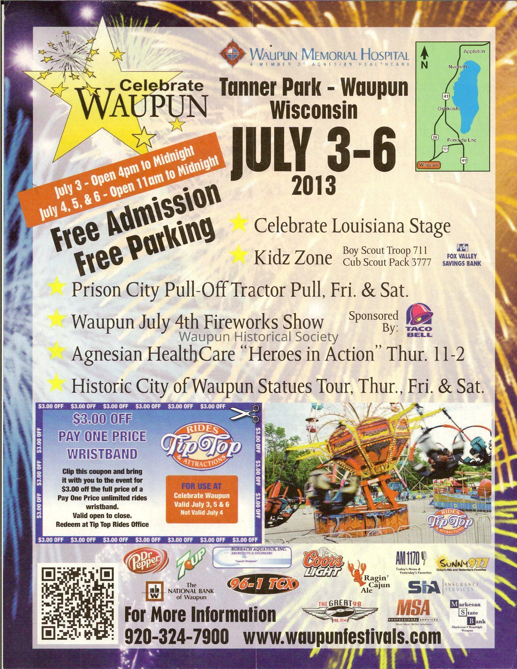 Advertisement Celebrate Waupun At Tanner Park- Waupun Wisconsin Of July 3, thur 6, 2013. With Prison City Pull and Tractor Pull and Variety of Stages Waupun July 4, Fire Work Show and 22, Live Bands.Acquisition