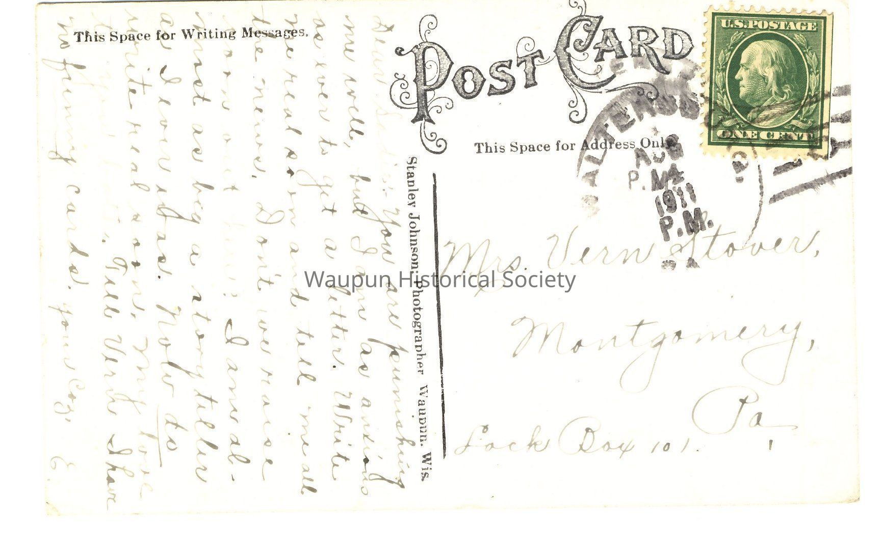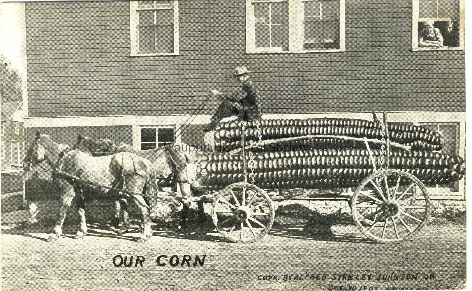 A "trick photo" postcard by Alfred S. Johnson Jr., Waupun, Wis. - "Our Corn", October 30, 1909, Waupun, Wis. addressed to Mrs. Vern Stover(Sadie), Montgomery, Pa.Acquisition