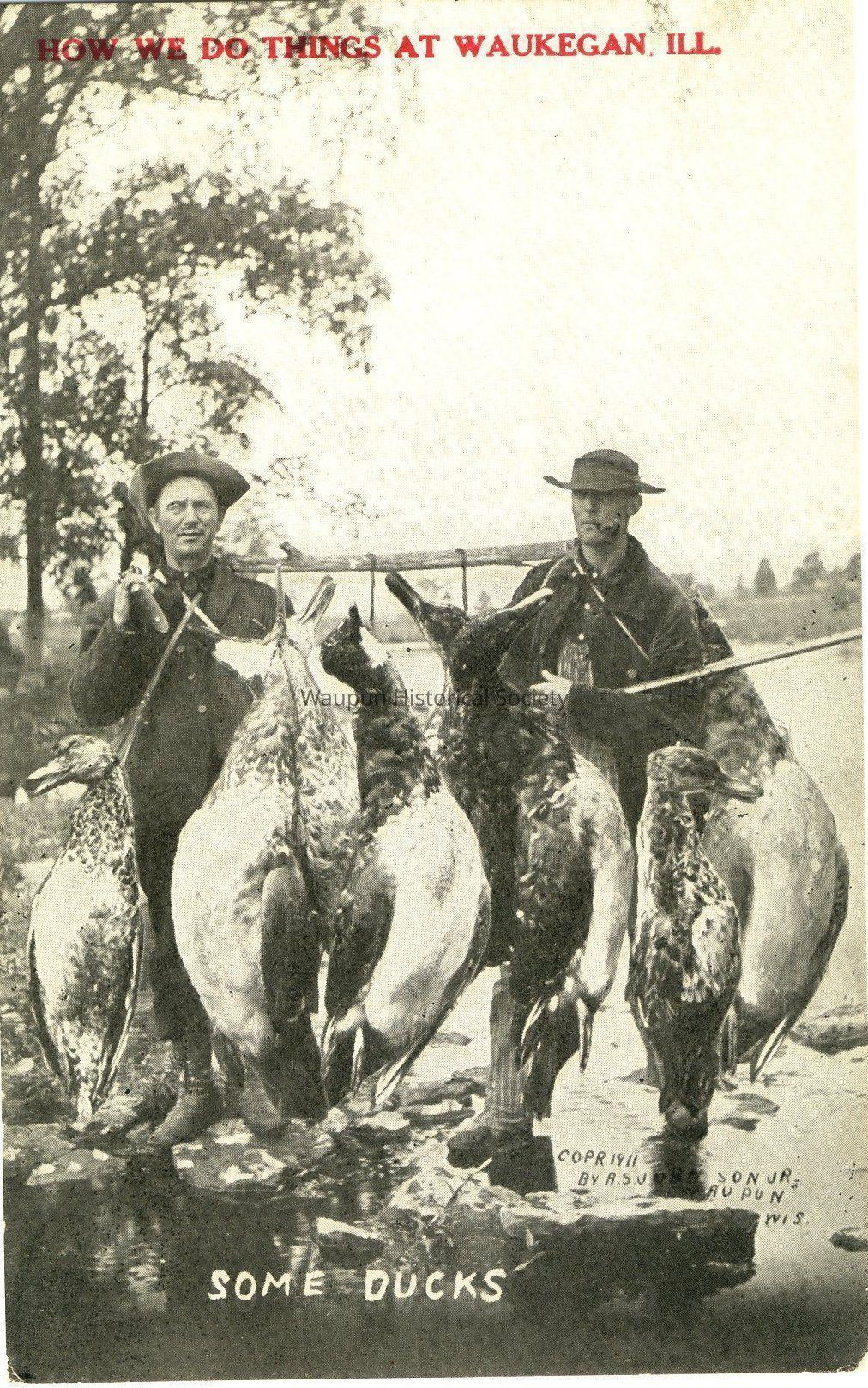 Photo postcard copyright by A. Stanley Johnson, Jr., Waupun, Wis. of "Some Ducks". How We Do Things at Waukegan, Ill. is typed on the front top of this postcard. One of many postcards purchased by Jim Laird on eBay.Acquisition