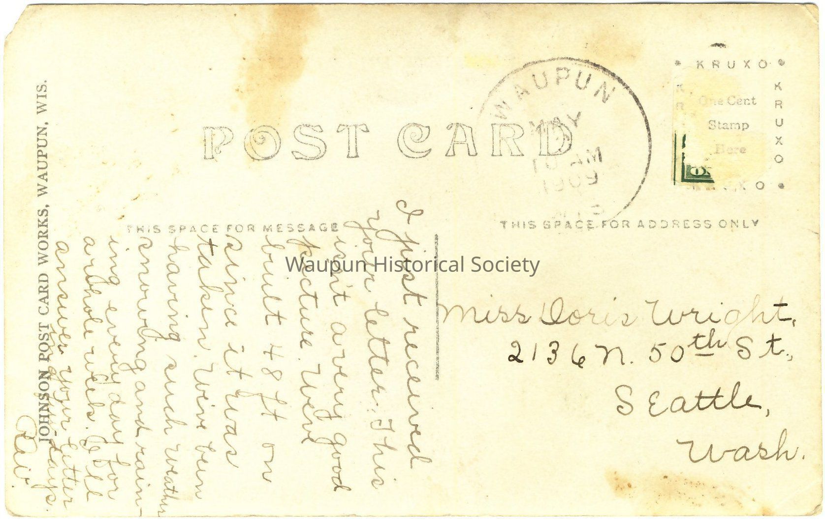 Photo postcard by A. Stanley Johnson, Jr., Waupun, Wis. of Oak Grove Farm, Holstein Friesian Herd, T. Wright, Waupun, Wis. addressed to Miss Doris Wright, 213 N. 50th St., Seattle, Wash. This is one of the many A. Stanley Johnson Jr. photo postcards purchased on eBay by Jim Laird.Acquisition