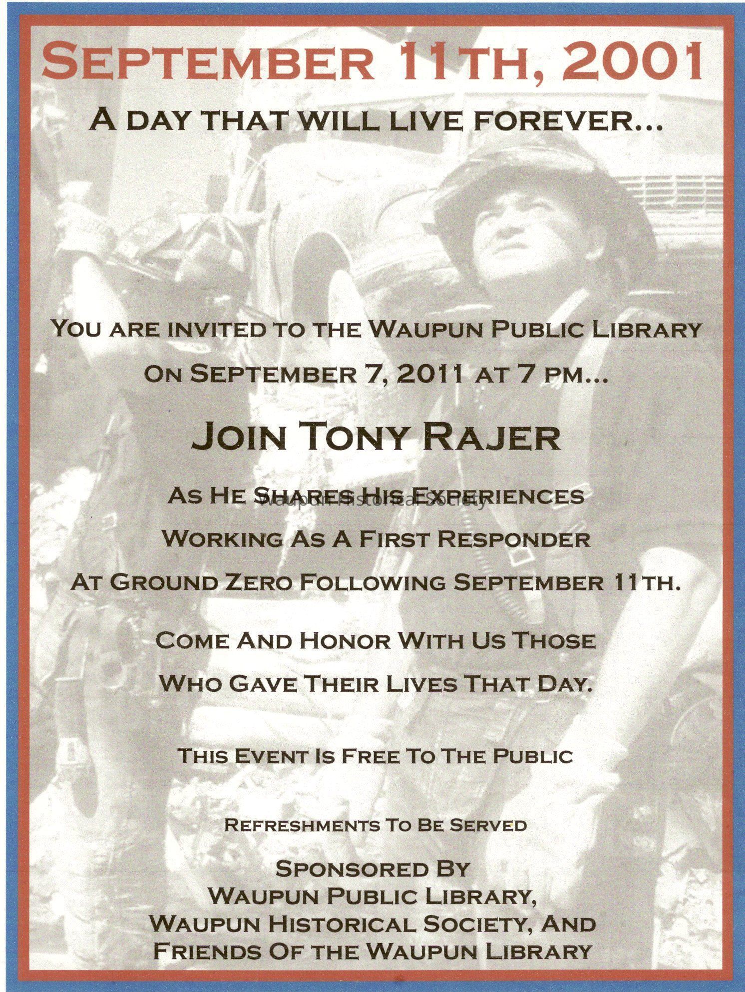 Advertisement Of (A Day That Will Live Forever) you are invited to the Waupun Public Library to come and experiences with Tony, Rajer. you are invited to as he shares his experience working as a first reponder at ground zero Following September 11, 2011.Acquisition
