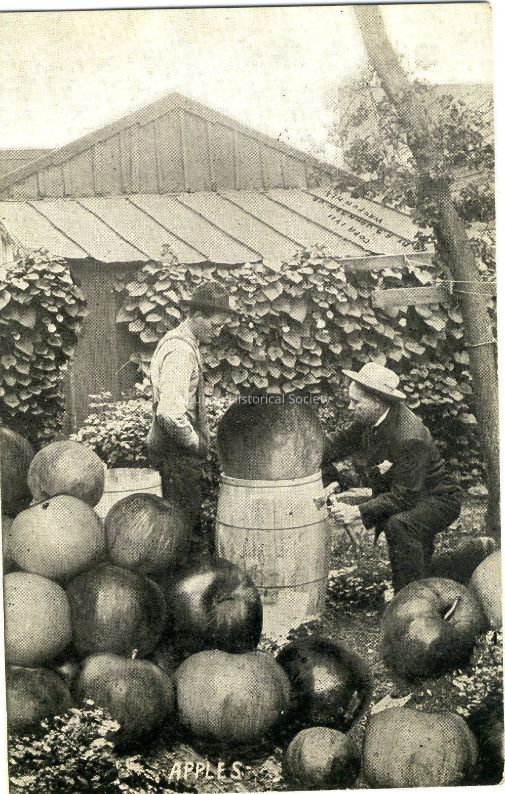 Photo postcard of 2 men trying to get a giant apple into a barrel. It is entitled, "Apples". Copyright 1911 by A. S. Johnson Jr, Waupun, Wis. One of many A. S. Johnson photo postcards purchased by Jim Laird via eBay.Acquisition