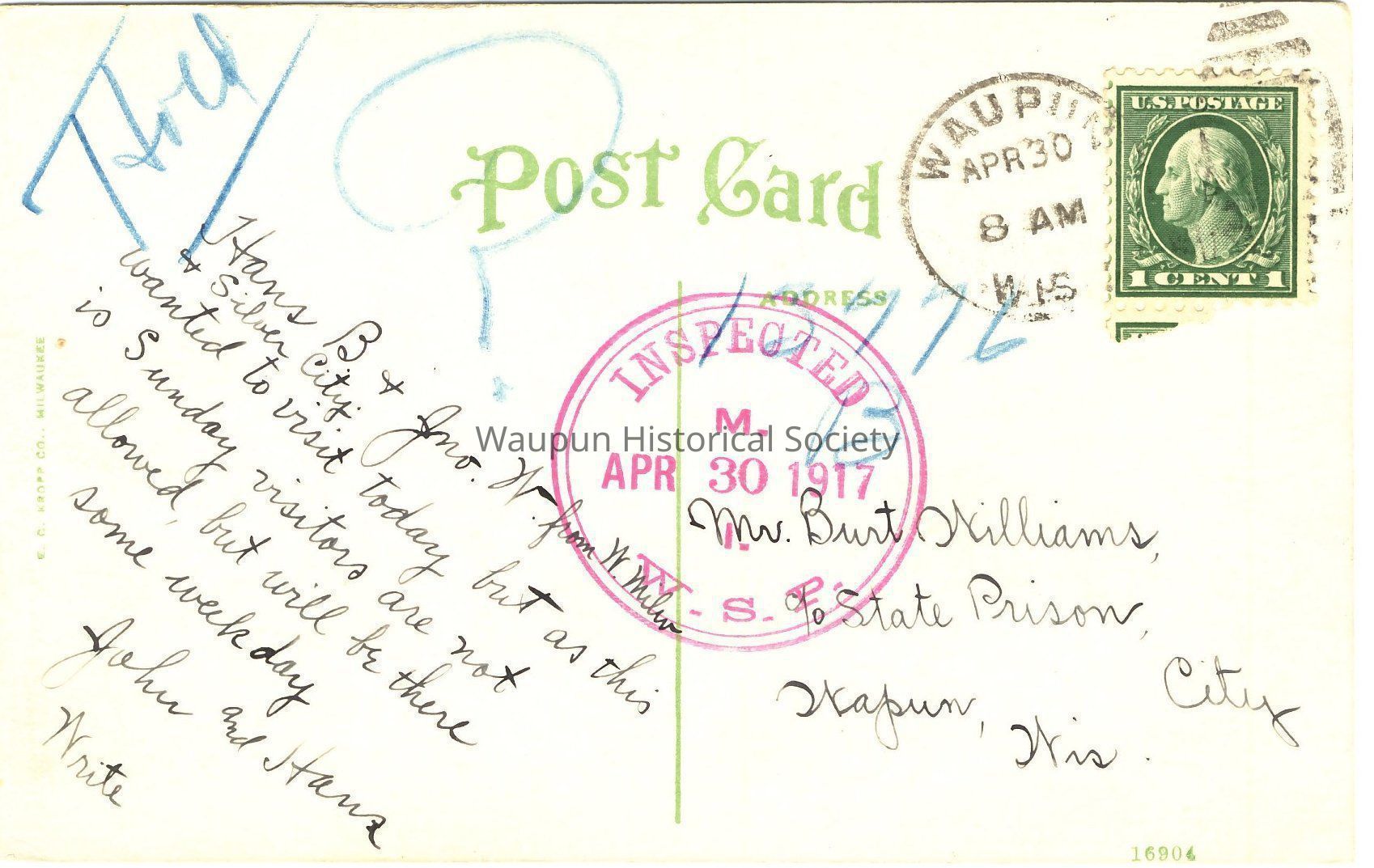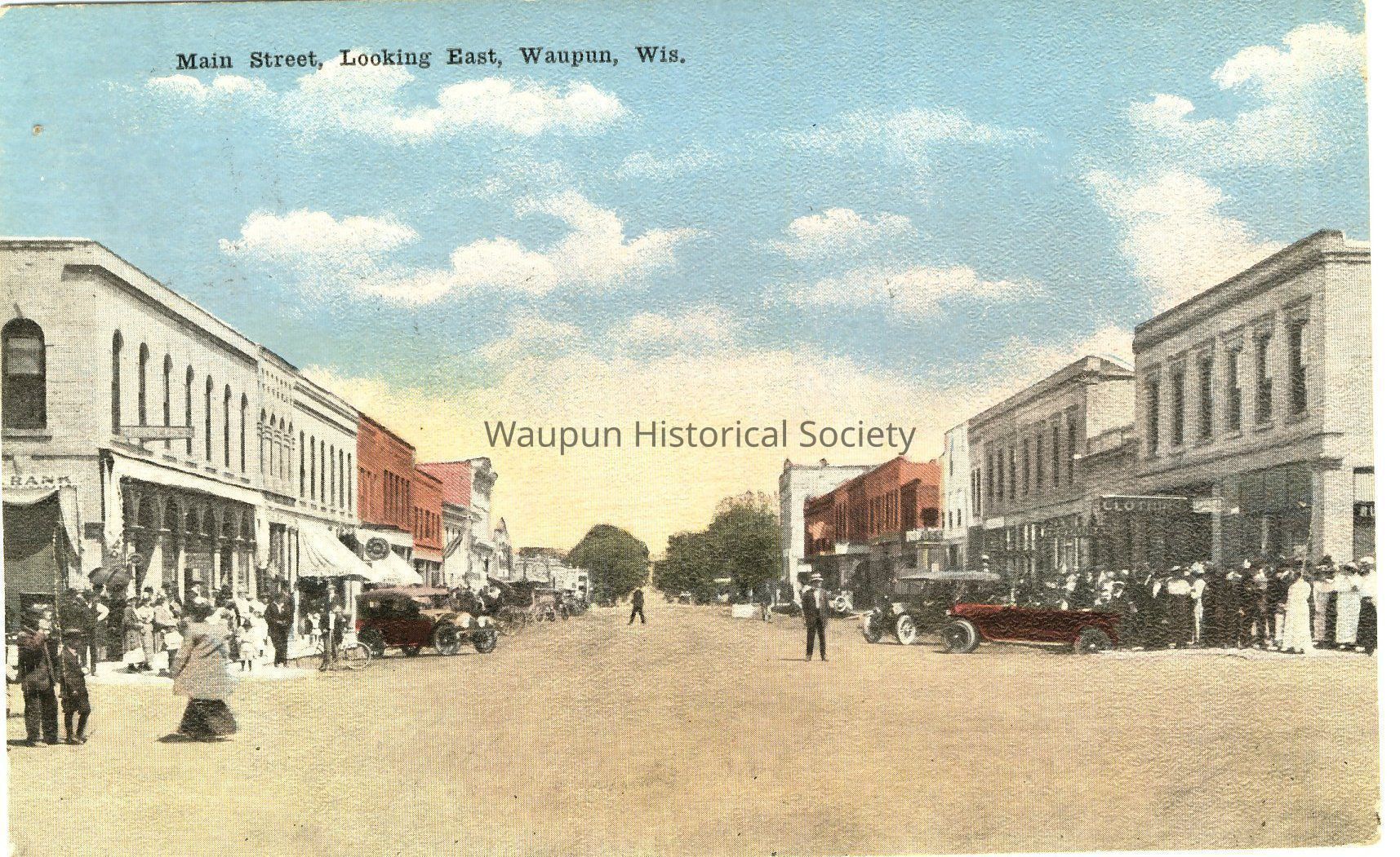 Postcard, Color photo postcard of Main Street, looking East, Waupun, Wis. It is addressed to Mr. Burt Williams, %State Prison, Waupun, Wis.