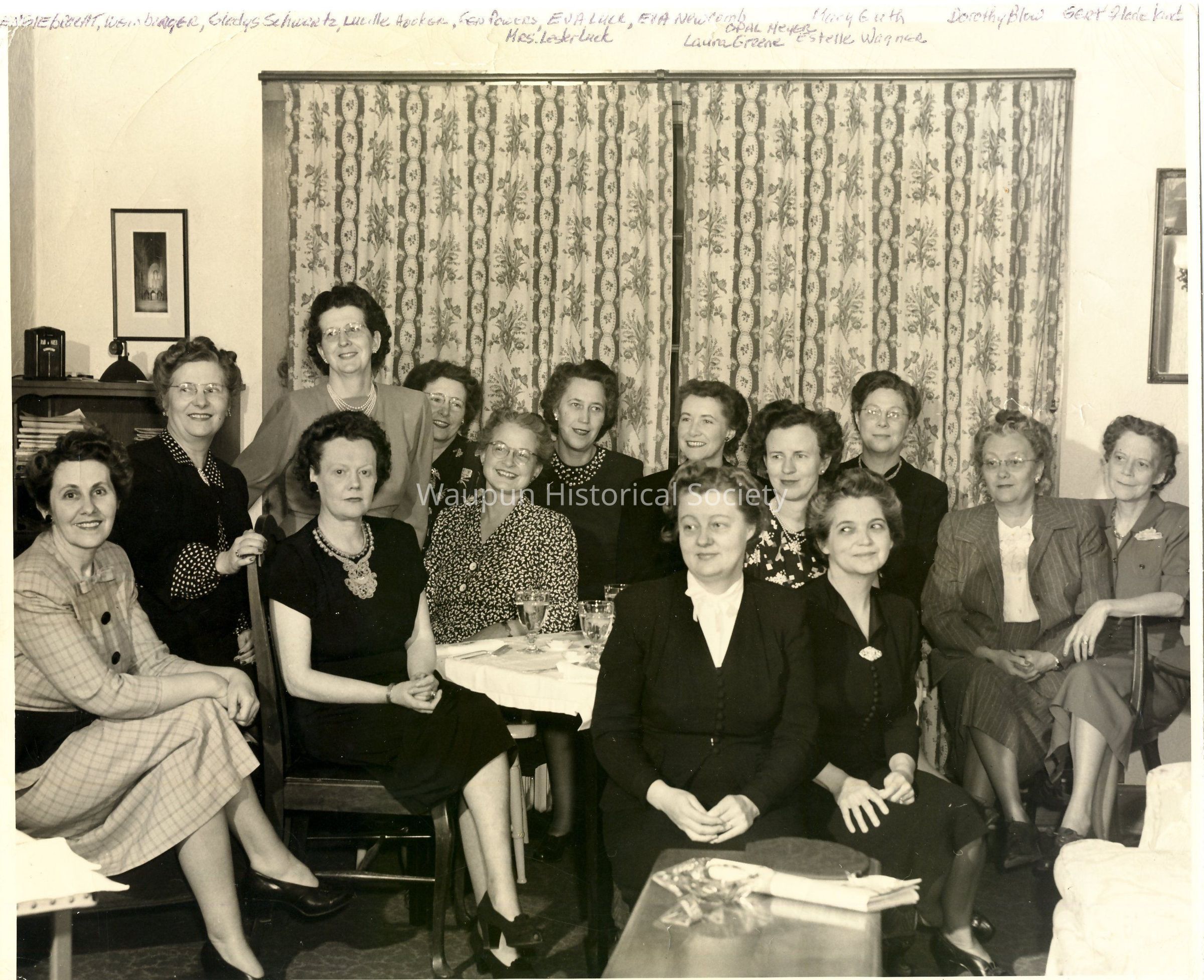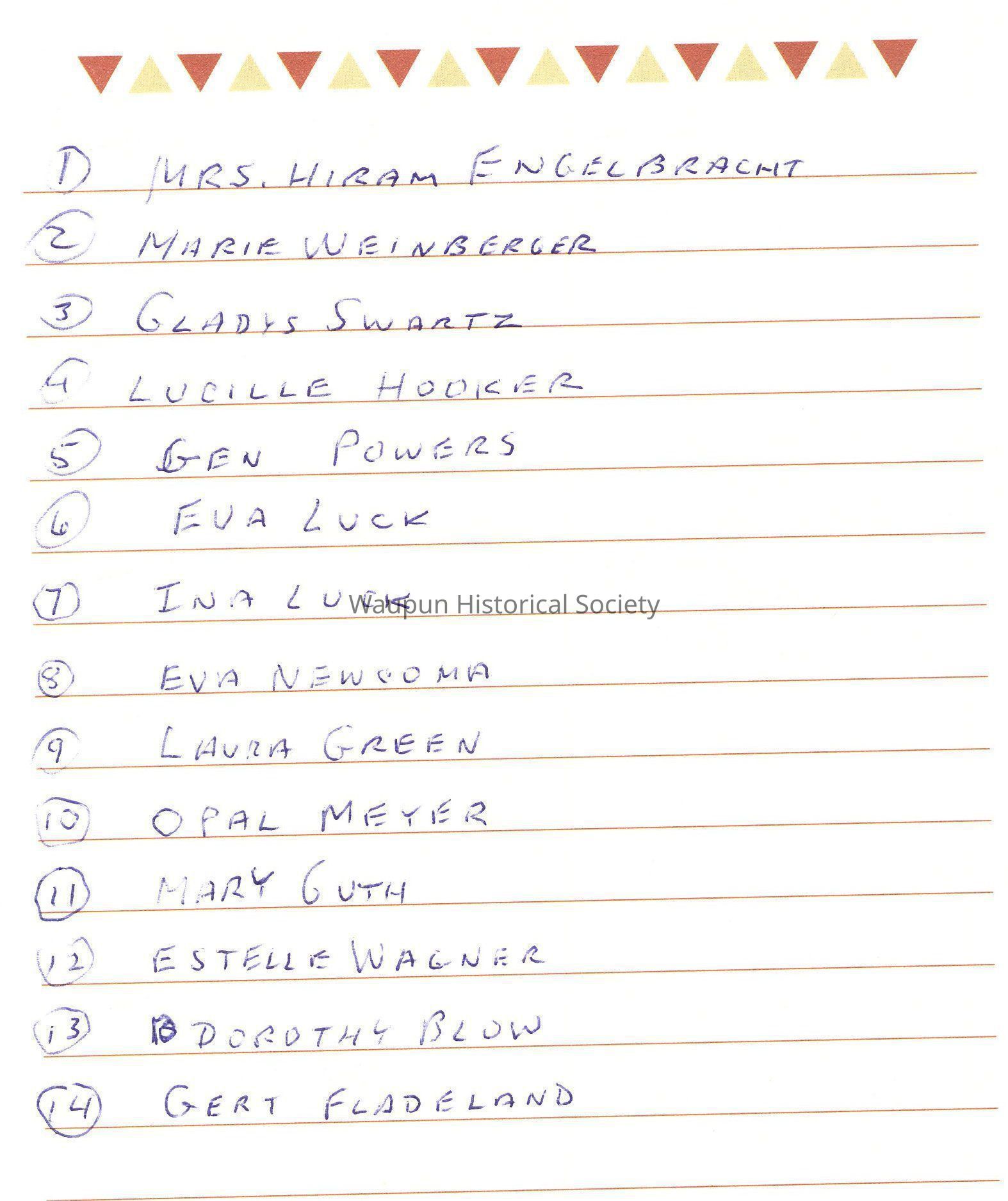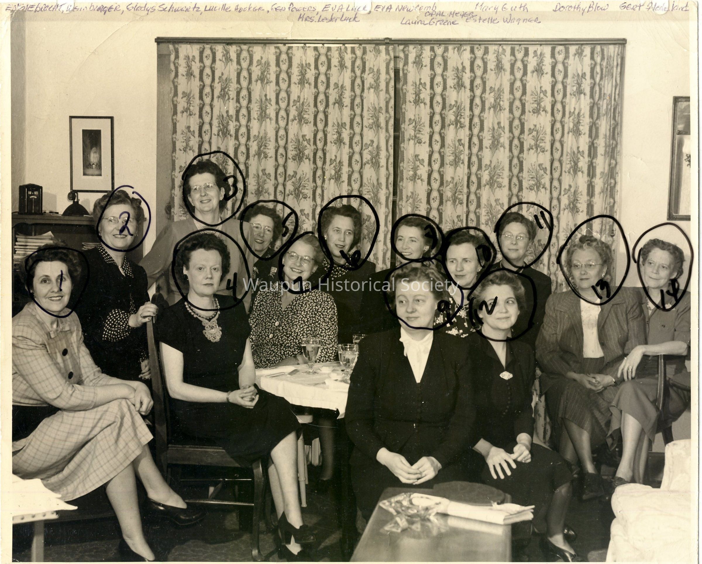 Photo of a group of women named from left to right and numbered and circled on the front of the plactic protector. The names are also written on top of the front of the photo. They are as follows: