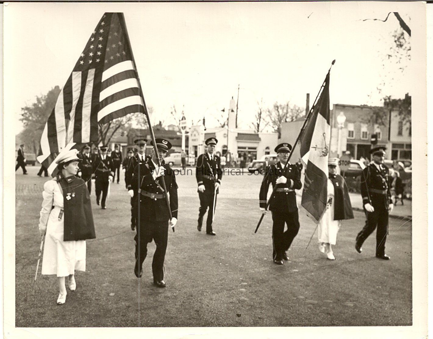 1- Picture of the Odd Fellow Lodge the Officers and the nurse are Marching down the street with the flags in a ParadeAcquisition
