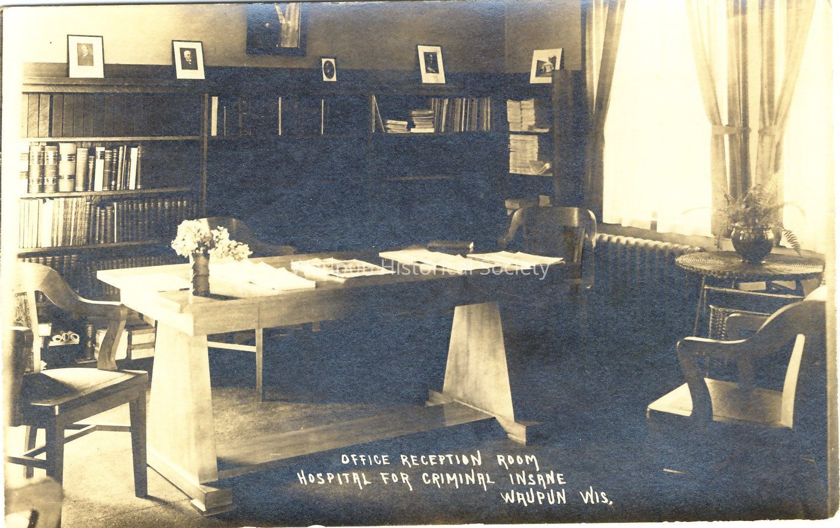 Postcard, Central State, Office Reception Room. Postcard of Office Reception Room at the Hospital for Criminal Insane, Waupun, Wis.