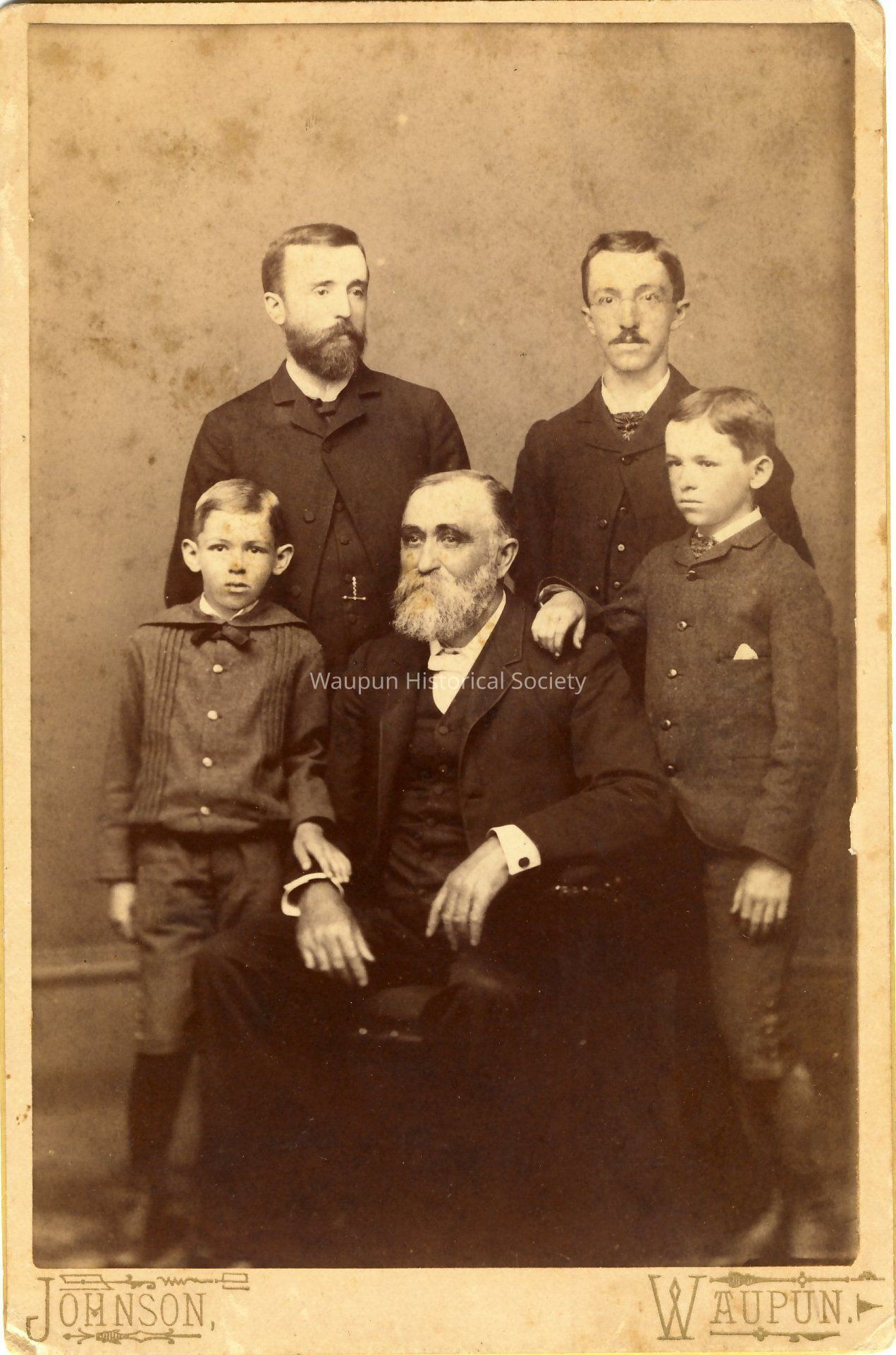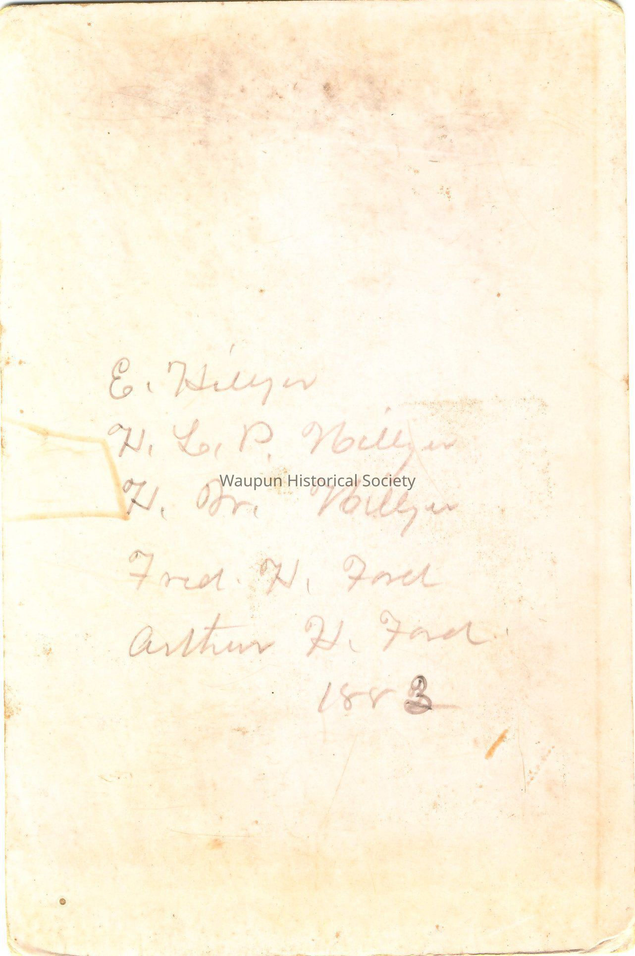 Photograph, Hiller and Ford. Photo from 1883 of 3 men and 2 boys. It indicates on the back that they are; (Edwin Hillyer) E. Hillyer, H. L. P. Hillyer, H. M. Hillyer, Fred H. Ford, and Arthur H. Ford. The photograher is Johnson, Waupun, Wis.Acquisition