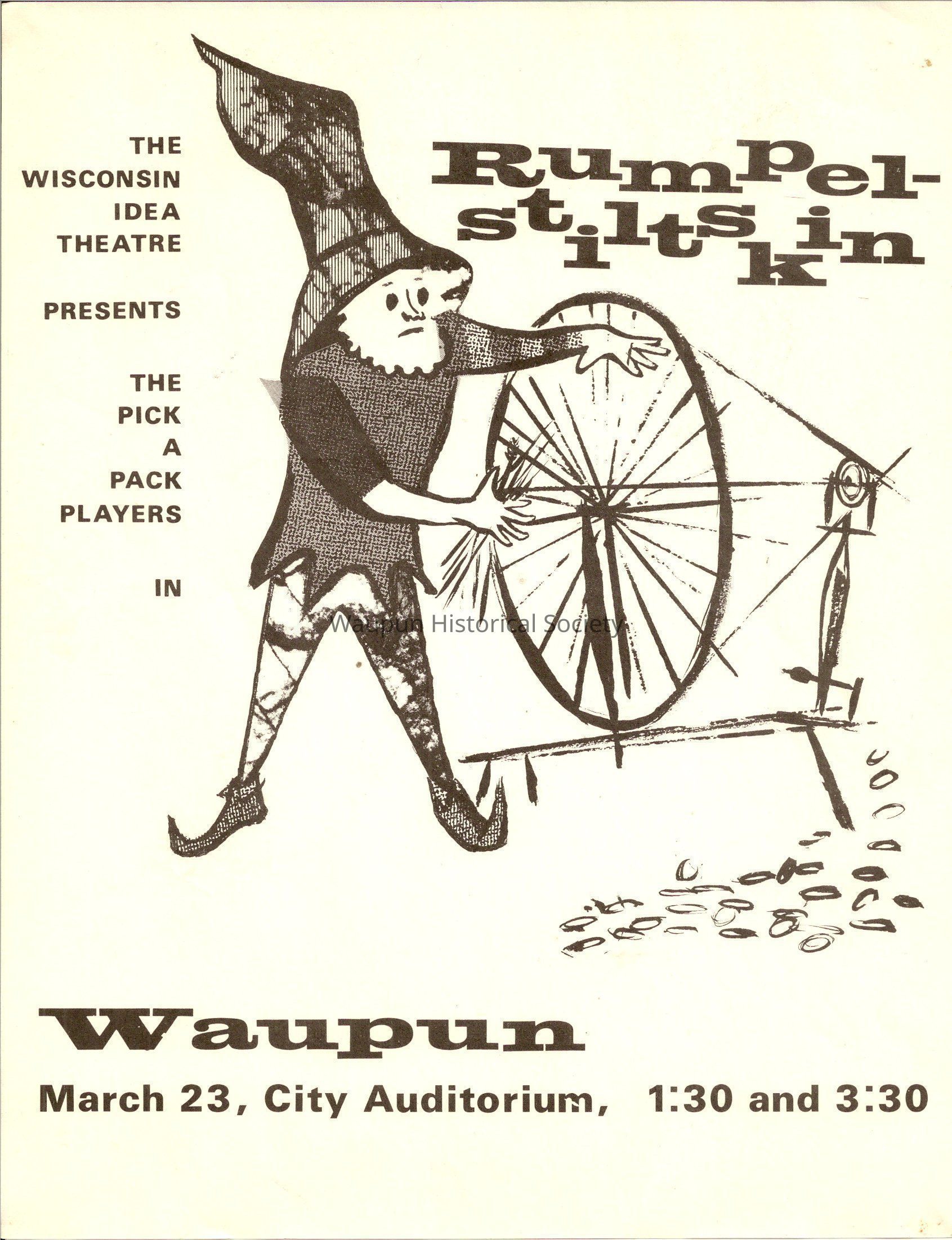 Advertisement The Wisconsin, Idea theatre presents the pick a pack of player in the play of ( RUMPEL STILTSKIN) at the Waupun, city Auditorium on March 23,Acquisition