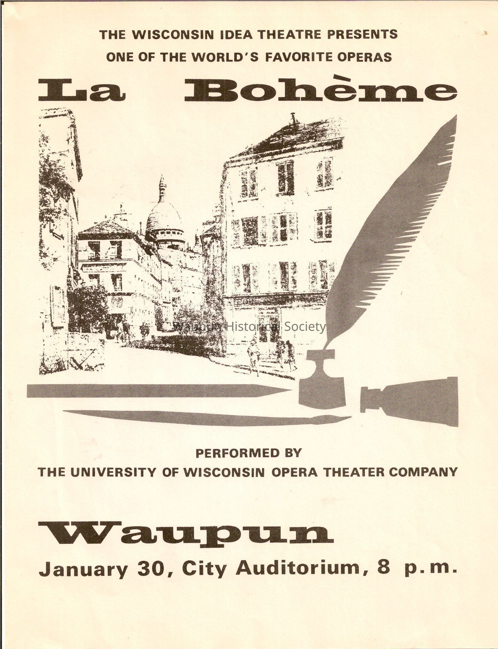 Advertisement: The Wisconsin Idea Theatre presents one of the world's favorite Operas. La Boheme will be performed by the University of Wisconsin Opera Theater Company at the Waupun, City Auditorium of January 30,Acquisition