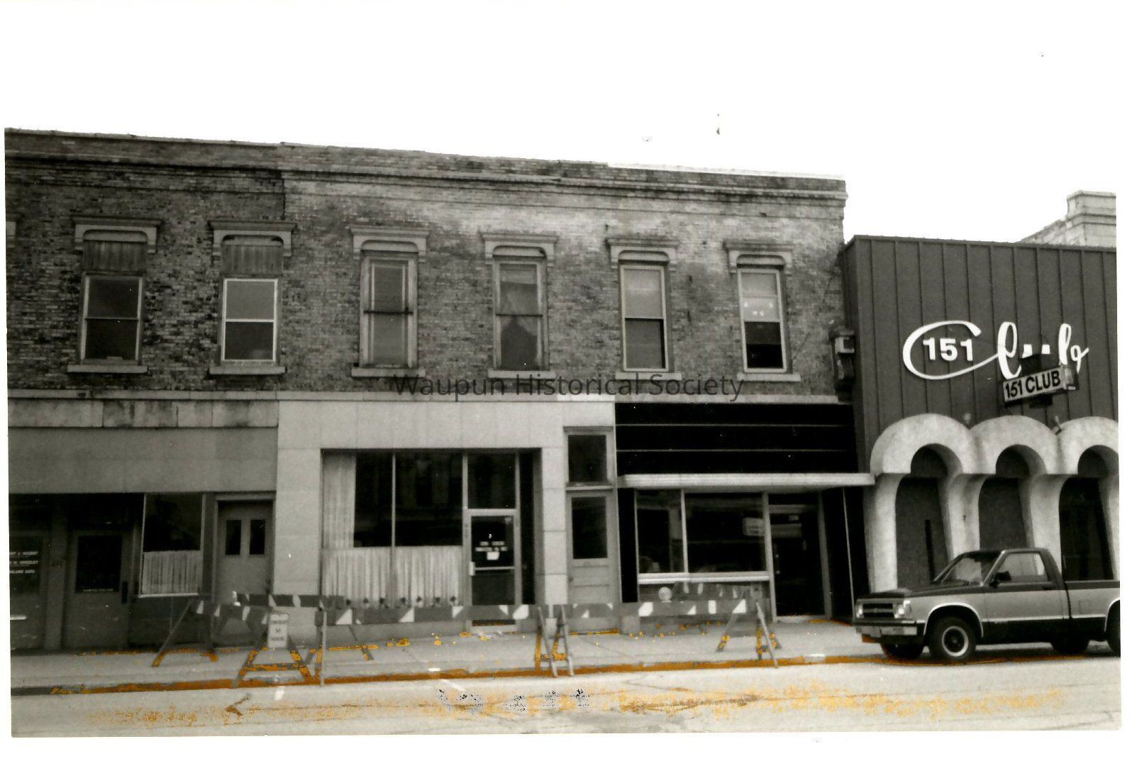 Photograph, Main Street, 405-411 East Main, Club 151. 1993 photo of Commercial buildings in the block of 405-411 E. Main, Waupun, WI. The building appearing in the photo was built in 1857 and was once the Corn Exchange Bank and Last Chapter. The name on the building in this photo at 405 E. Main is the 151 Club. This photo is in the Wisconsin History pictorial files under #15452.Acquisition