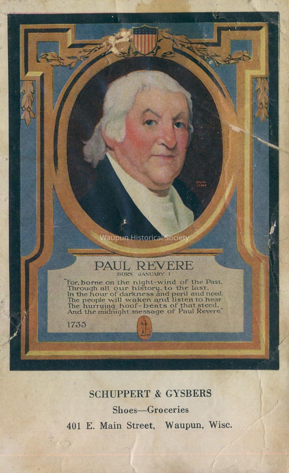 Schubert & Gysbers. This postcard is in the personal collection of Jim Laird. It shows a patriotic poem, about Paul Revere, and advertises Schuppert & Gysbers shoes - Groceries store at 401 E. Main Street in Waupun. This is an unused, undated postcardAcquisition