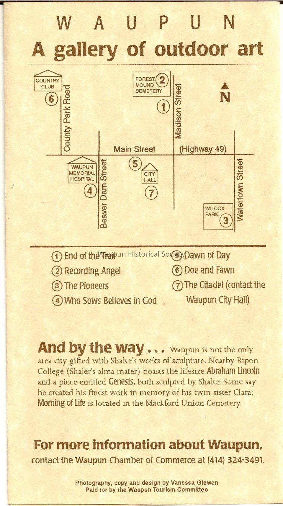 A Pamplets of Waupun, Wisconsin the City of Sculpture the End of the Trail, Who Sows to Believes in God, The Citadel, Recording Angle and the Pioneer and the Doe and Fawn the sculpture of the city of waupun.Acquisition