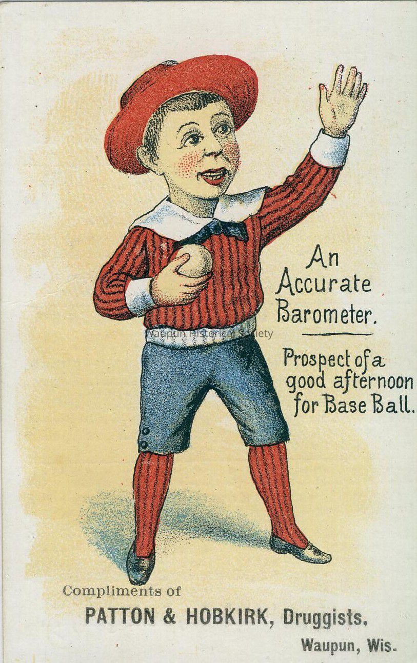 Patton & Hobkirk, Druggists. This business card is in the personal collection of Jim Laird. It shows a comic figure about to play baseball.Acquisition
