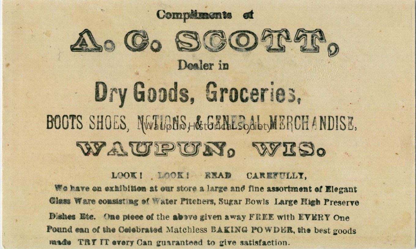 A. C. Scott company. This business card is in the personal collection of Jim Laird. It is one of a series of 5 comic cards, that advertises the A.c. Scott company using cats. On the back of the card is says: Compliments of A.C. Scott, dealer in Dry Goods, Groceries, Boots, shoes, notions, & general merchandise. Waupun, WI.Acquisition
