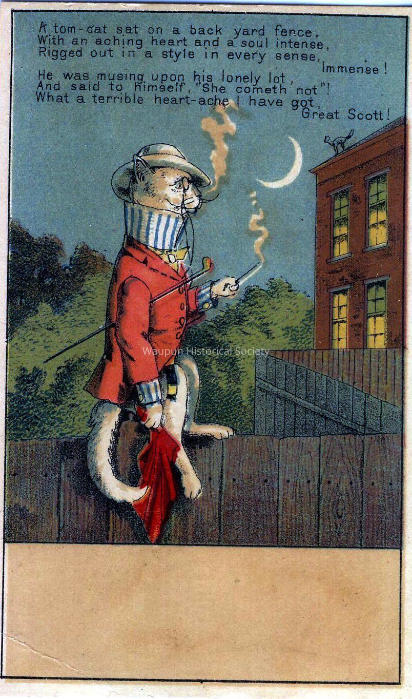 A. C. Scott company. This business card is in the personal collection of Jim Laird. It is one of a series of 5 comic cards, that advertises the A.c. Scott company using cats. On the back of the card is says: Compliments of A.C. Scott, dealer in Dry Goods, Groceries, Boots, shoes, notions, & general merchandise. Waupun, WI.Acquisition
