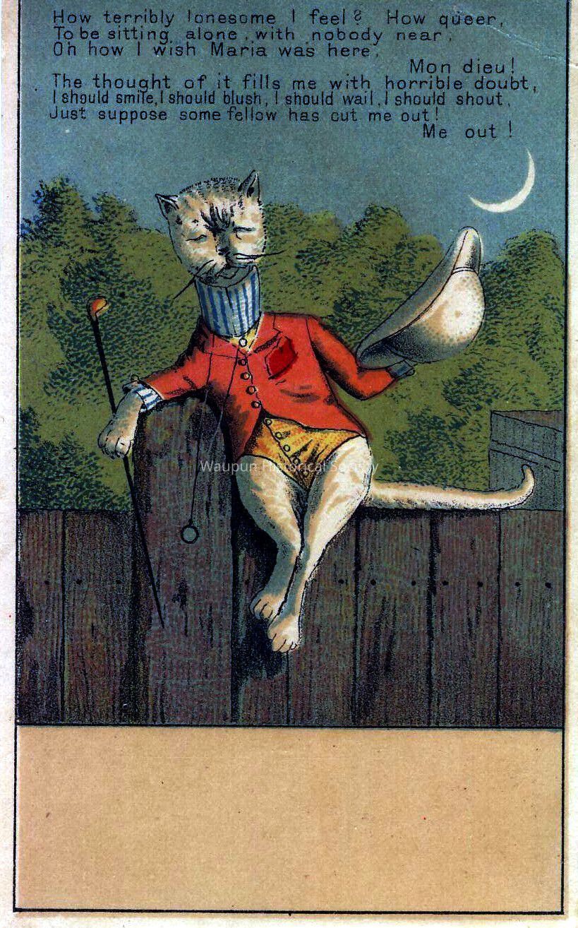A. C. Scott company. This business card is in the personal collection of Jim Laird. It is one of a series of 5 comic cards, that advertises the A.c. Scott company using cats. On the back of the card is says: Compliments of A.C. Scott, dealer in Dry Goods, Groceries, Boots, shoes, notions, & general merchandise. Waupun, WI.Acquisition