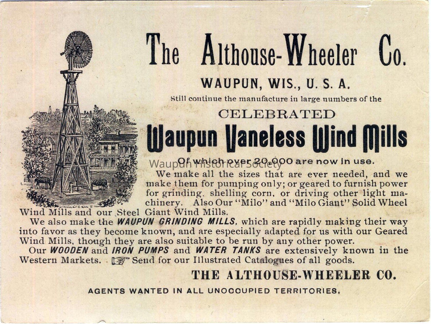 The Althouse-Wheeler Co. This small card is in the personal collection of Jim Laird. It advertises the Althouse-Wheller Co. and it's "Celebrated Waupun Vanelss Wind Mills."Acquisition